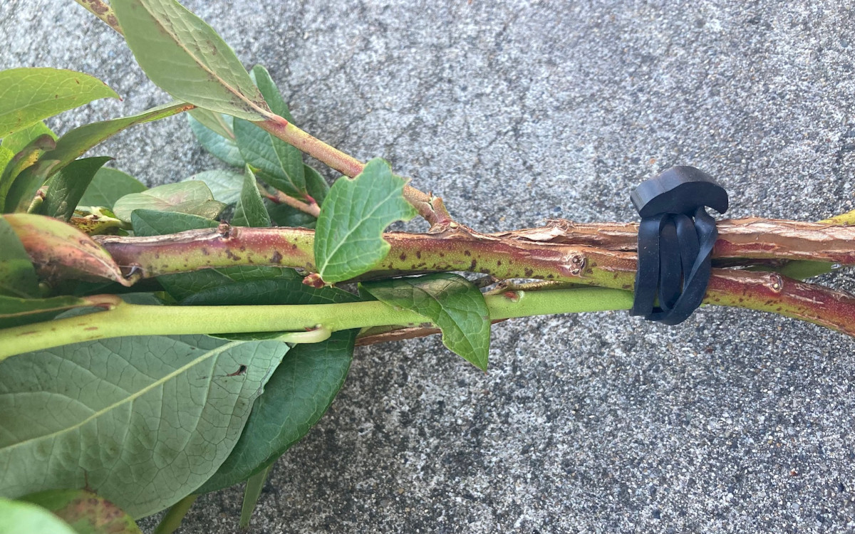 試しに家で栽培しているブルーベリーの枝をカットしてまとめてみました。1周だけだと少し隙間ができたので、ゴムを2周させてから突起端部分に引っ掛けて固定します。突起部分も多少伸びるので引っ掛けやすく、またかなりしっかりと固定することができました。