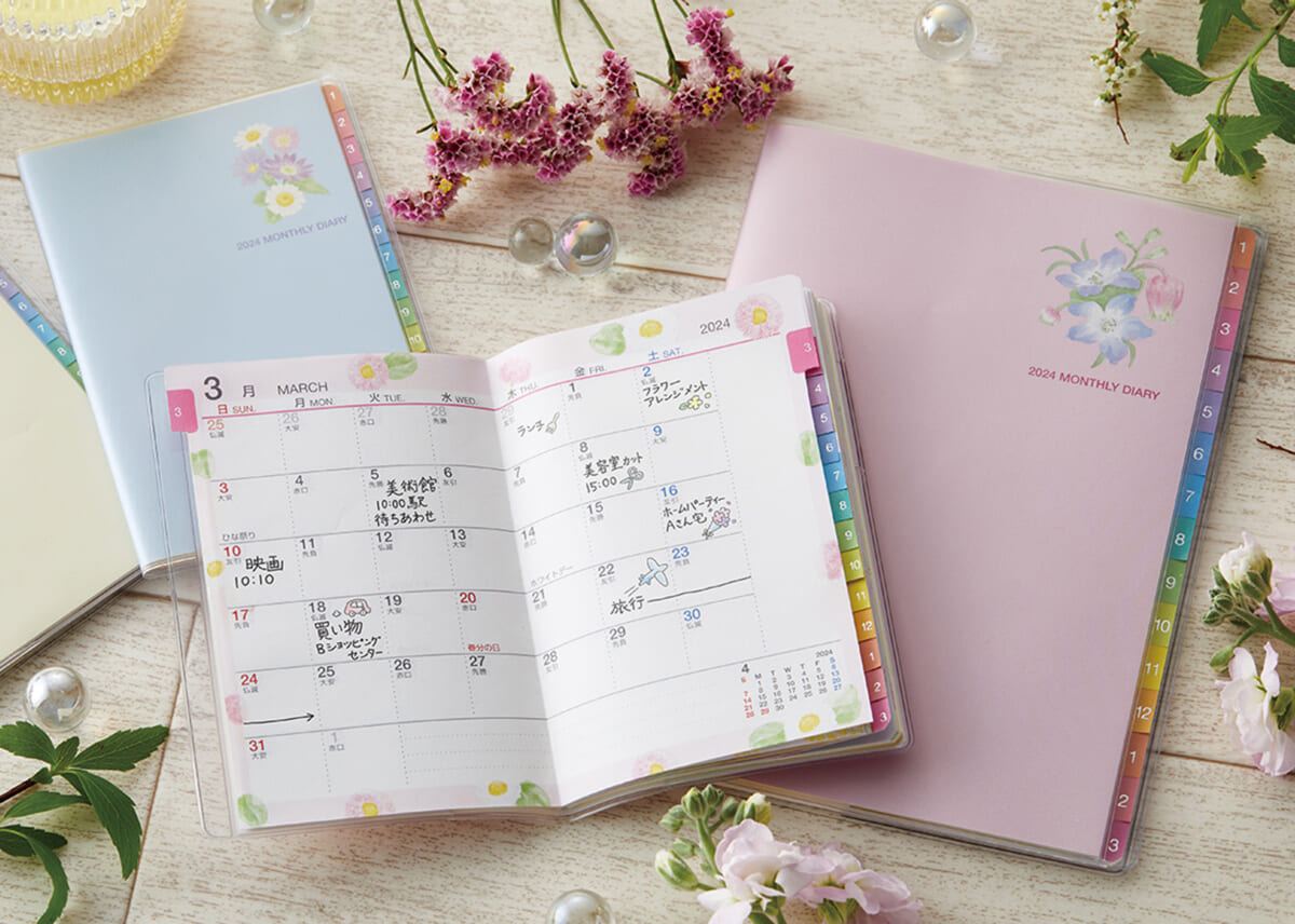 価格は、月曜始まりのポケットB7が750円、B6が1100円。日曜始まりのポケットB7が800円、B6が1200円。シンプルなデザインの月曜始まりに対して、日曜始まりは月ごとに異なる花柄がページにプリントされているので、華やかなデザインが好きな人はぜひチェックしてほしい。