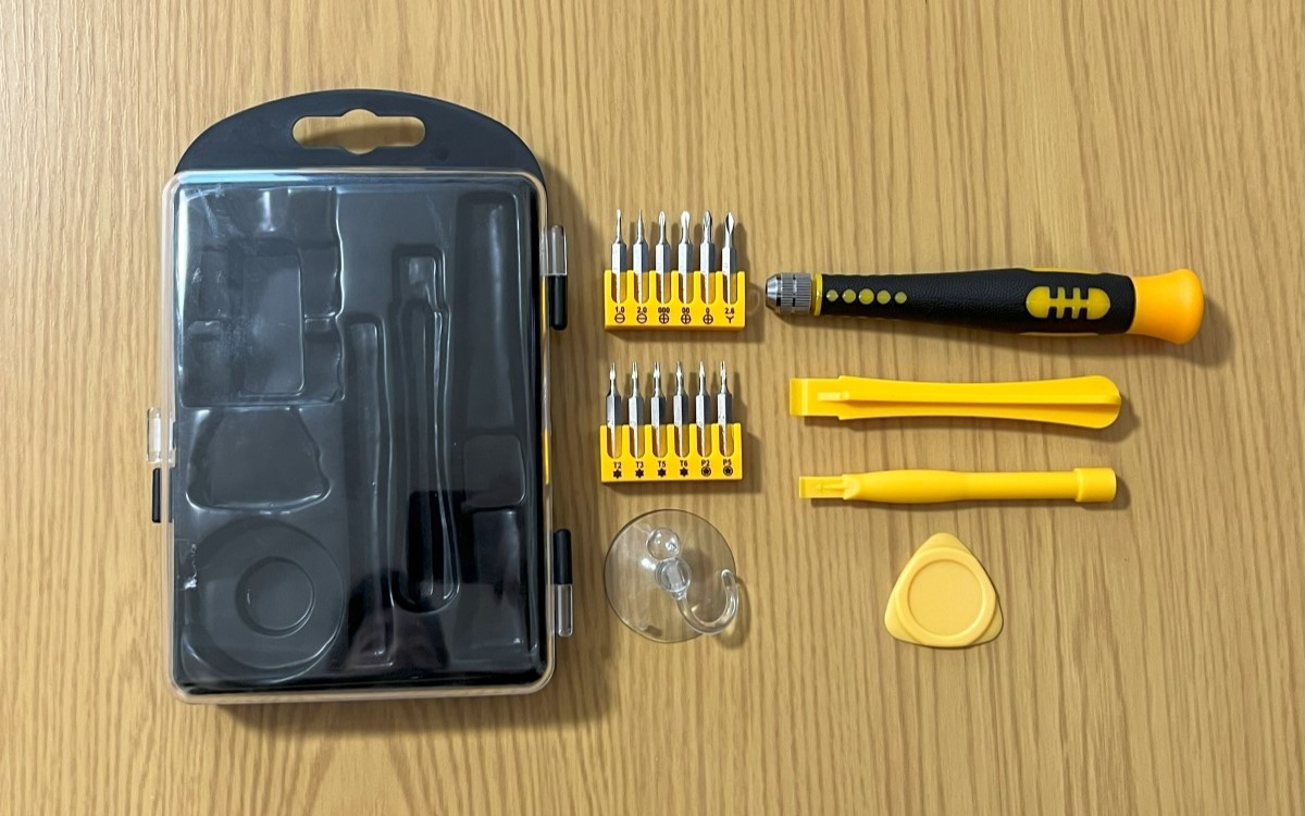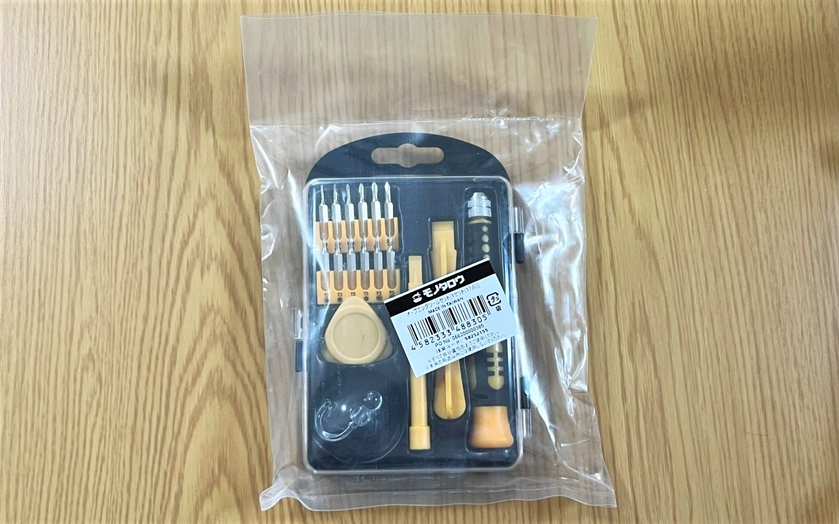 今回購入した「オープニングツールセット」は、17点の工具がセットになって1309円(税込)とコスパに優れた商品。ドライバーハンドル、オープニングツール、オープニングピック、吸盤フック、12種類のドライバービット(+・-・Y型・星型・六角形)がセットになっています。