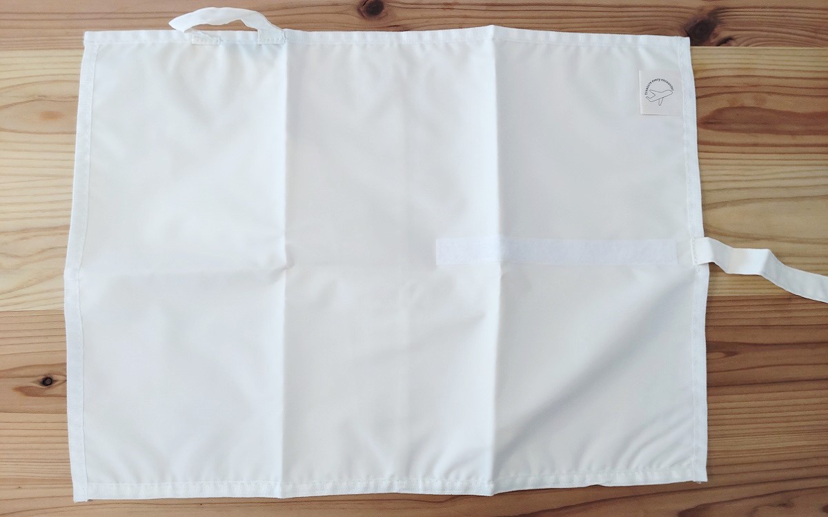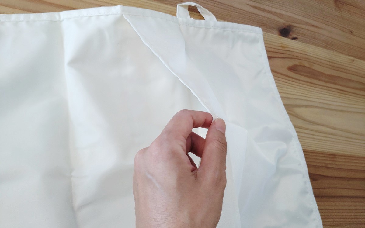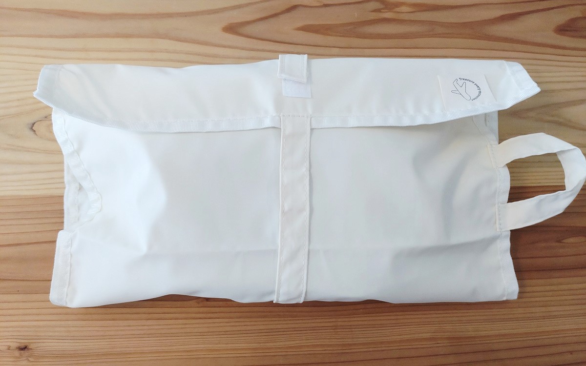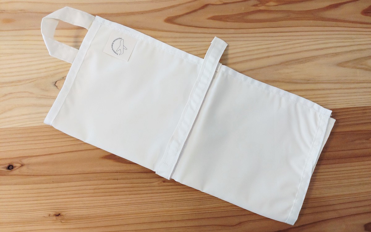 パッケージから出しただけでは、真ん中に面ファスナーのベルトがついた長方形の布といった状態。端についている飛行機マークのタグが旅行気分を盛り上げてくれます。ベルトを開いていくと1枚の大きな布になりました。大きさは約縦36×横50cm。3つ折りになっていたので、開いてみるとかなり大きく感じます。
