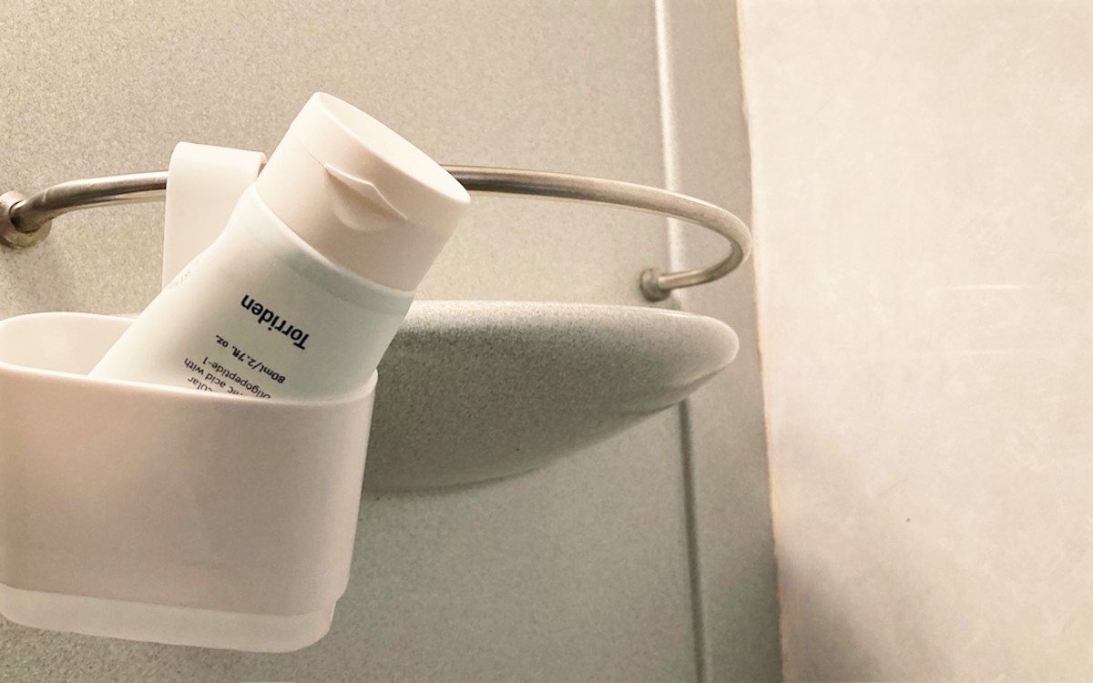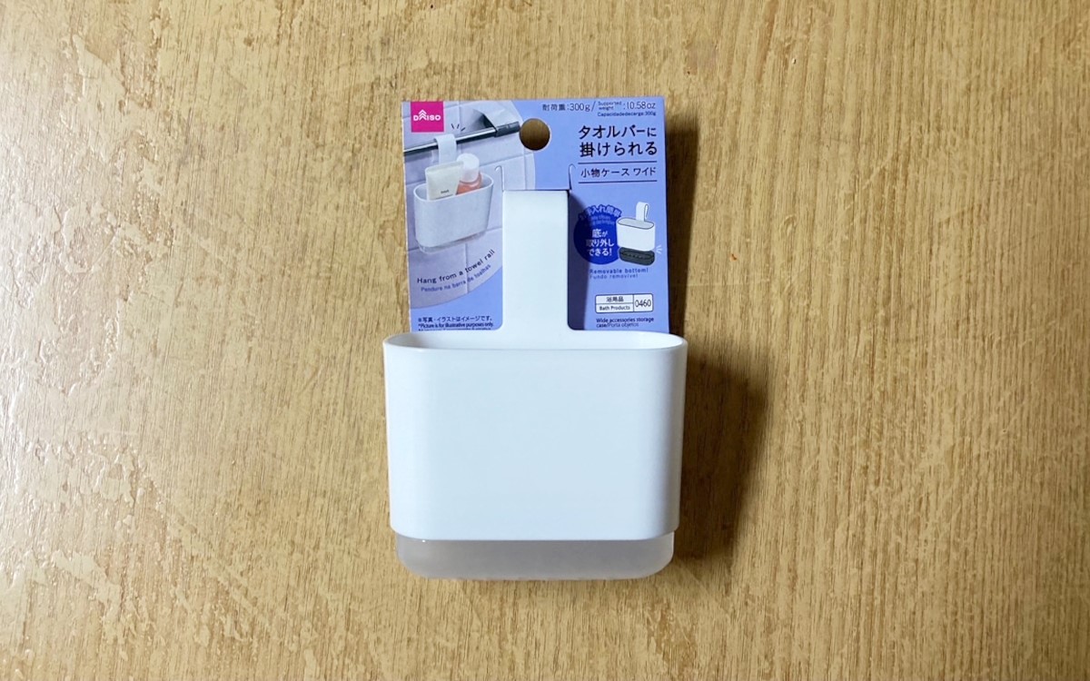 お風呂の棚に置きっぱなしの洗顔料やシャンプー類。容器の底に水が溜まって黒ずんでしまうのがいつも気になっていました。たまたまダイソーで買い物をしているときに見つけたのが、今回ご紹介する「タオルバーに掛けられる小物ケース(ワイド)」(110円/税込)です。