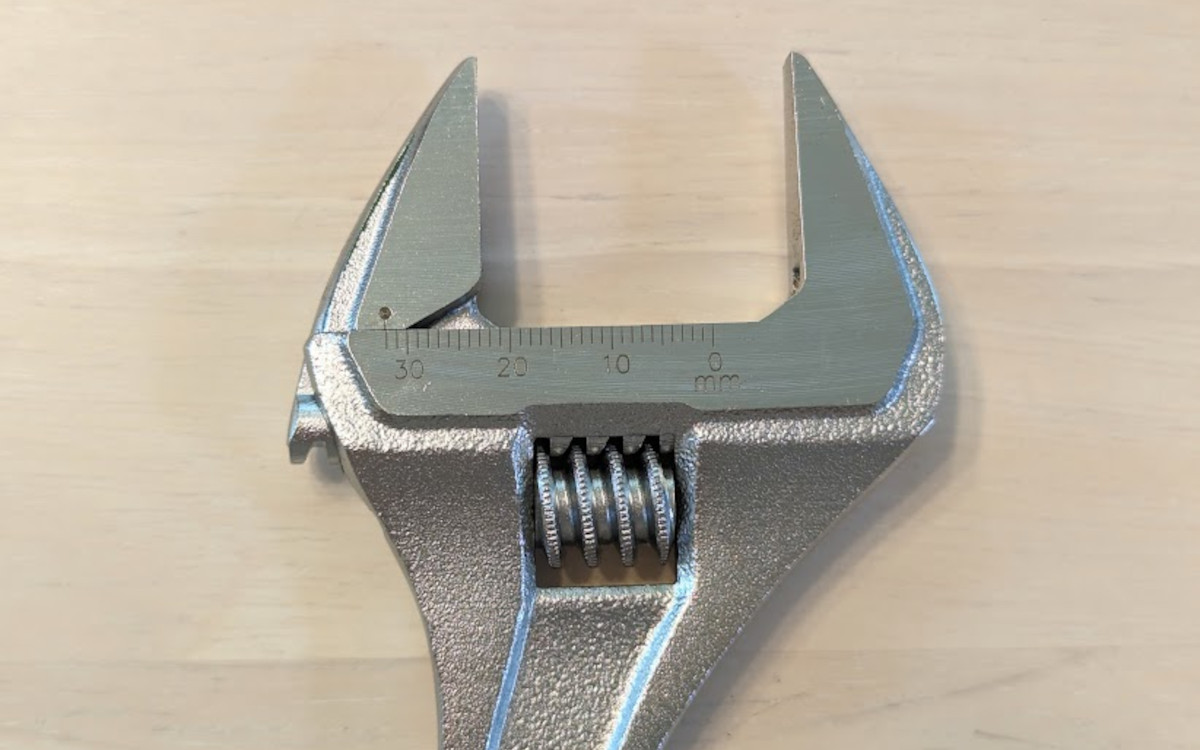 全長203mmで重さが240g、先端の厚さは5mmありました。材質はクロムバナジウム鋼で作られており、かなりしっかりした作りになっています。ボルトやナットのサイズはM3~M10まで対応しているため、1本あれば複数サイズに合わせられるのがポイント。メモリも付いていて、0~32mmまで開くことができるワイドタイプなのも嬉しいですね。