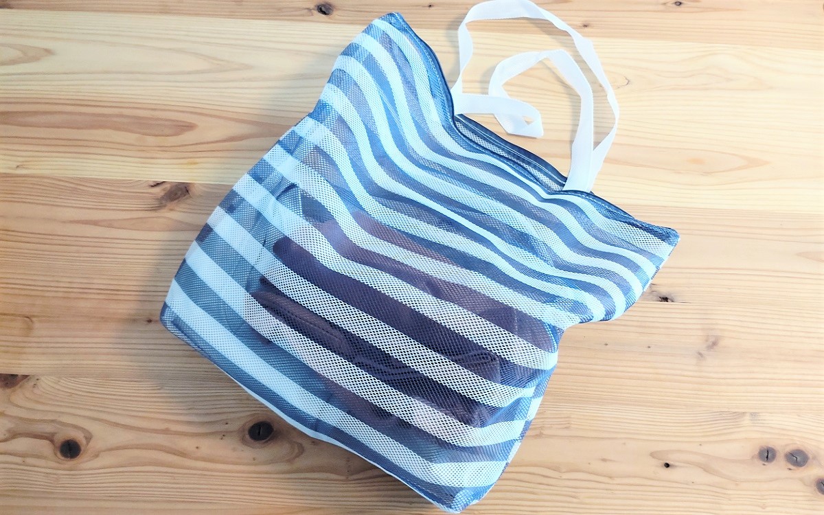 見た目はメッシュ素材で作られた普通のトートバッグ。サイズは幅39×縦40×マチ10cmと少し大きめです。試しにTシャツを3枚ほど入れてみましたが、まだまだ余裕がありました。これだけ大きければ、衣類だけでなくタオルなんかも入れられますね。