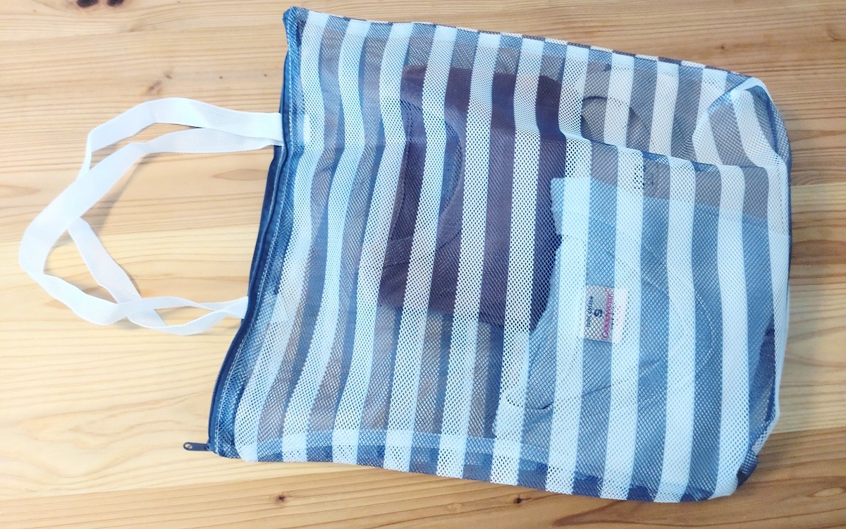 また、帰る時に着た後の服をこのトートバッグに入れておけば、帰ってきてそのまま洗濯機に放り込めて便利! 持ち手が中に入っているので洗濯機の中で絡まることはありません。旅先だけでなく、普段もたとえば脱衣所にトートバッグの持ち手をフックか何かで引っ掛けておいて、脱いだものをポイポイと入れてチャックを閉めて洗濯機に… なんて使い方もできますね。