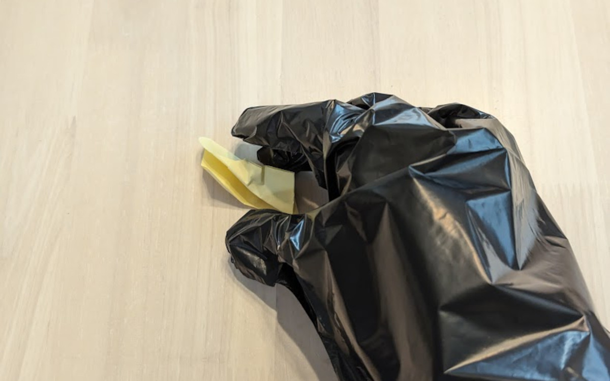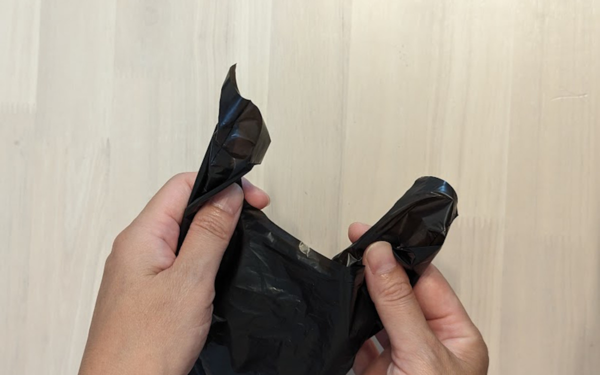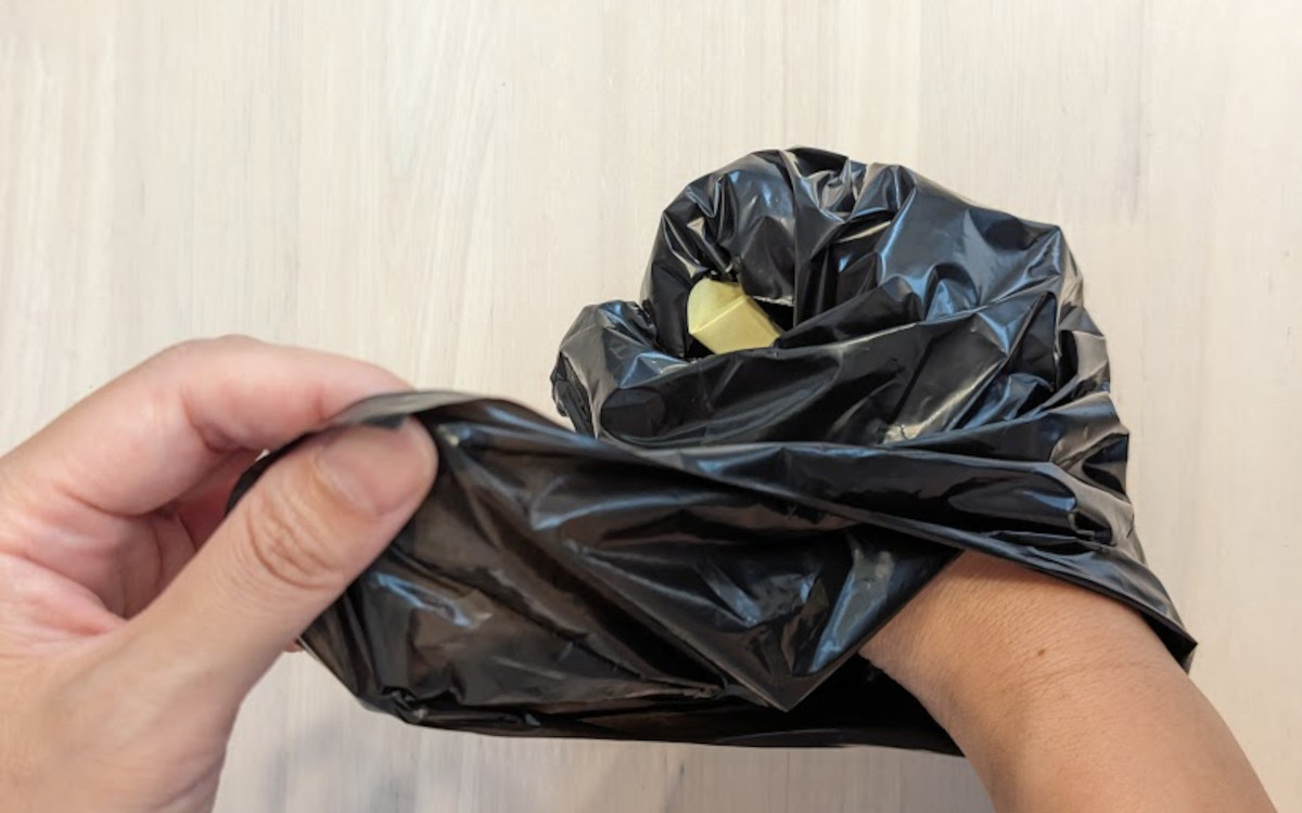 さっそく手袋に手を入れて、試しに紙ゴミを取ってみました。指が1本1本自由に動かせるので、袋の上からでもゴミをつかみやすかったです。散らばったゴミを集めながら取ることもできそう。