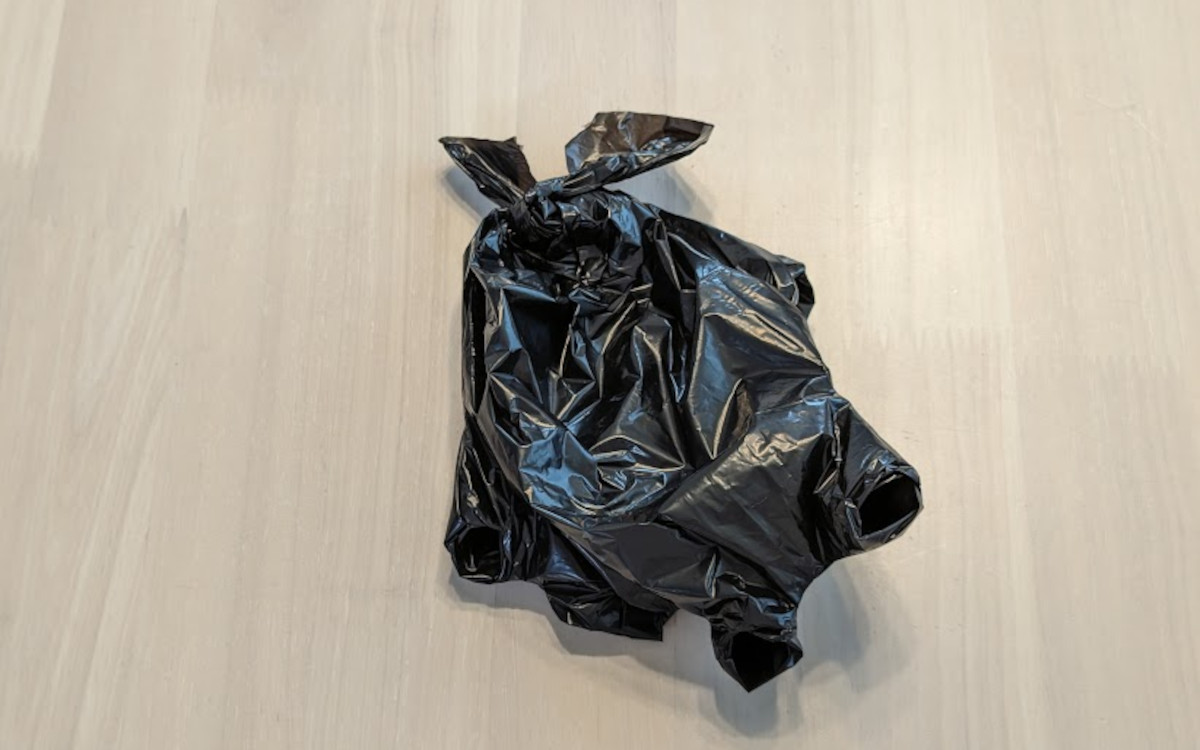 実際の大きさは約33(縦)×26(横)cmで、手にはめるとかなりゆとりのあるサイズ。男性でも女性でも使えて左右どちらにはめてもOKです。手のひら部分は大きめですが、指部分の長さはわりと短めな作り。手袋の裾にあたる部分は左右が少し長くなっていて、ゴミを入れたら紐のように結ぶことができます。黒色なので中身のゴミが見えにくいのもありがたいですね。
