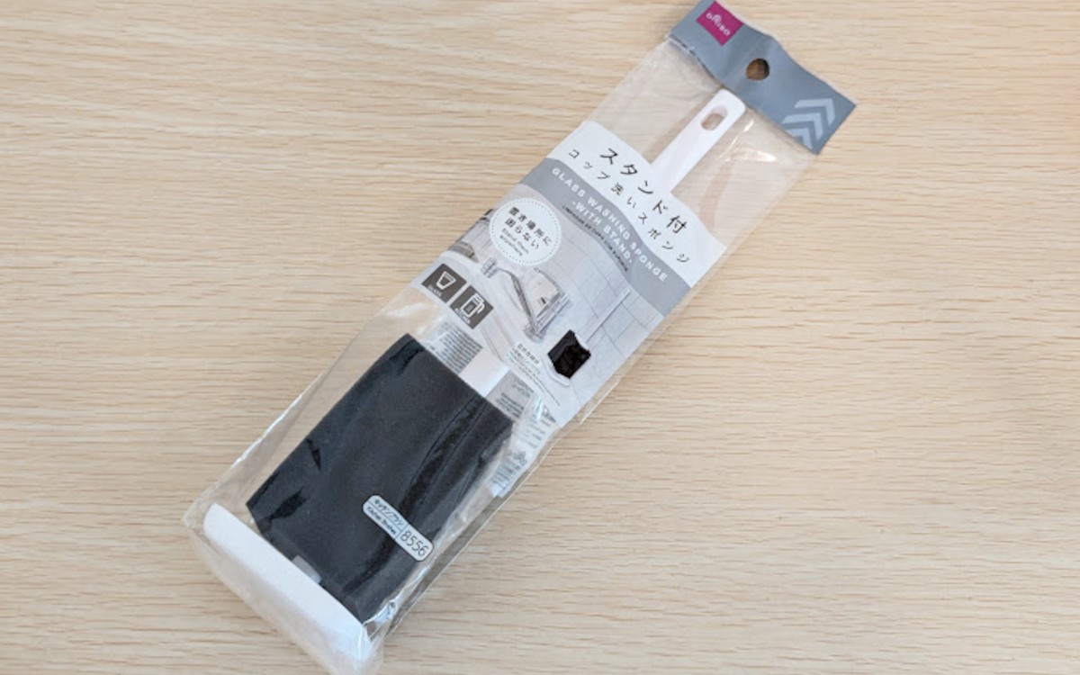 コップや冷水ポットなどを洗う時に長い柄のついたスポンジで洗っているのですが、いつも置くところに困ります。壁に引っかけておくと垂れた水滴が気になるし、乾いていないスポンジをしまうわけにもいかないですよね。すぐ使える場所に出しておきたいのですが、いい方法が見つからないままなんとなく放置…。今回ご紹介する「コップ洗いスポンジ(スタンド付)」(110円/税込)は、そんな悩みにピッタリな商品です。