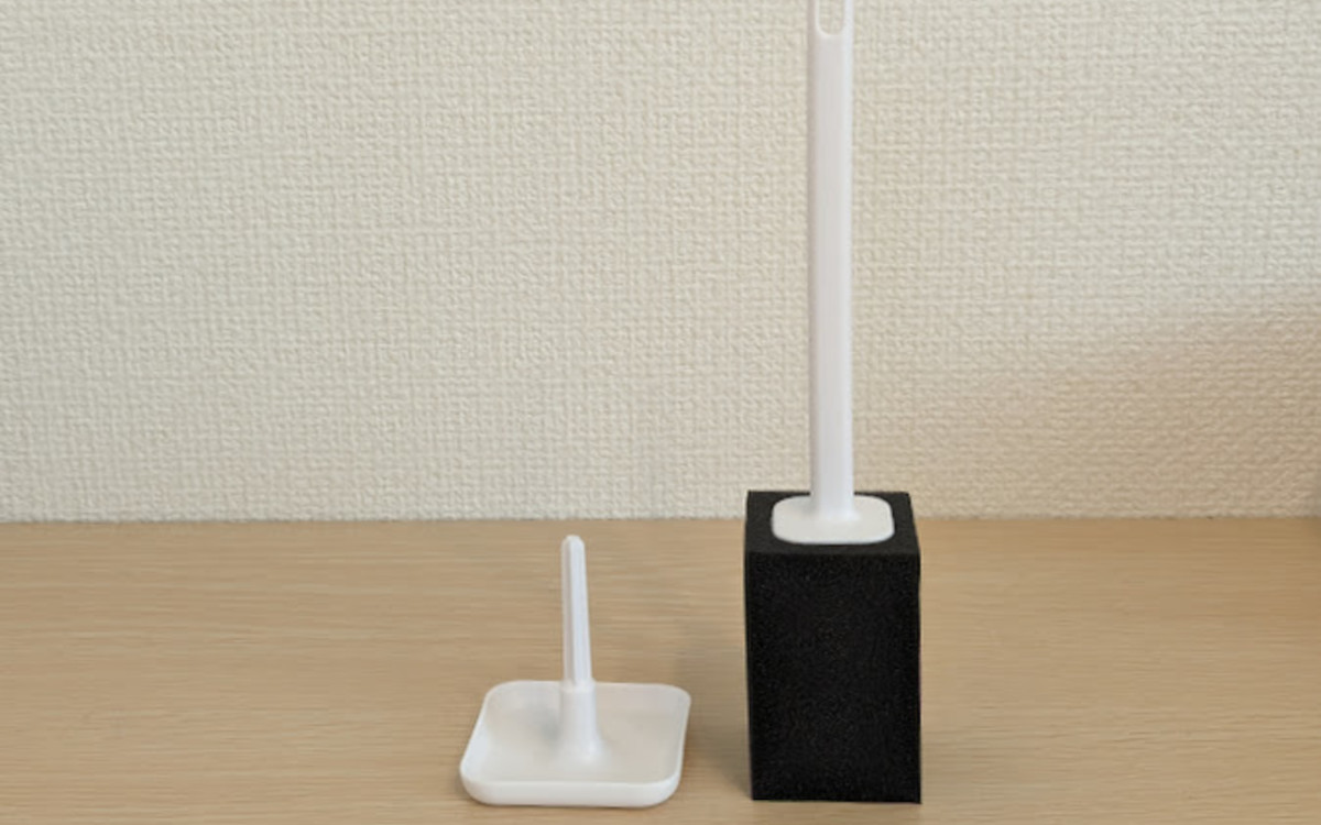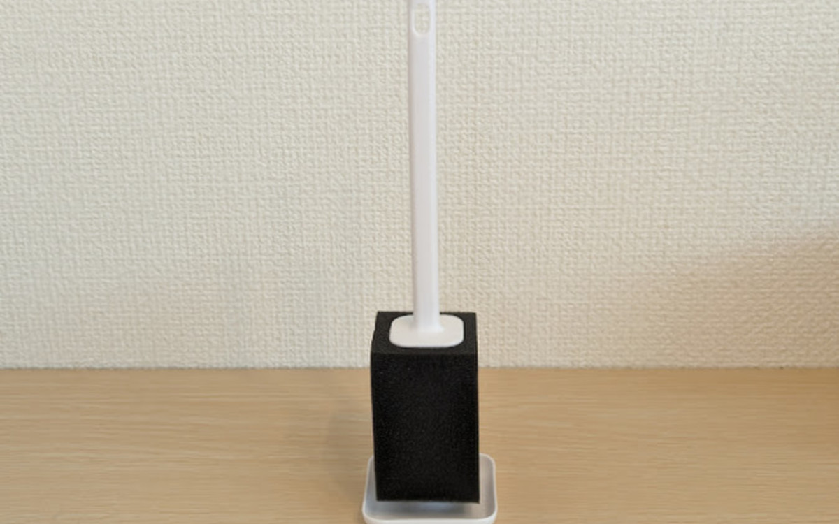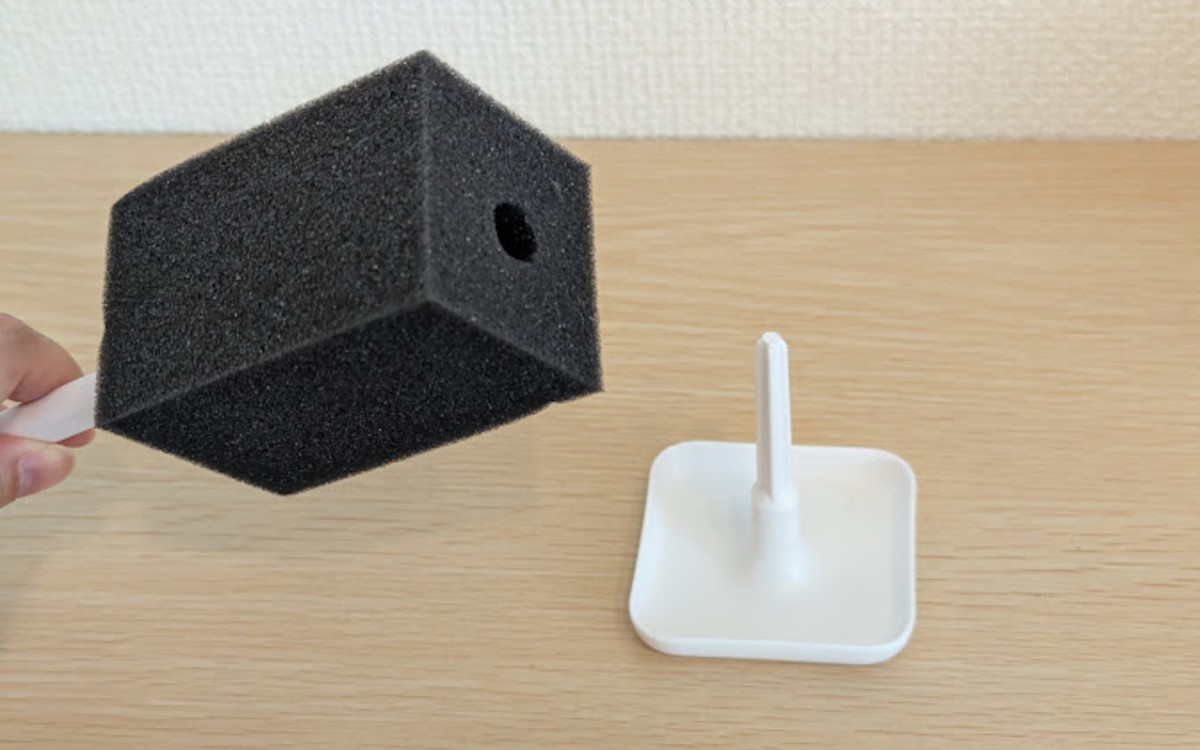 スポンジの底に穴が開いていて、スタンドの真ん中に付いている柱を差し込むように立てます。スタンドの底は安定感があり、簡単に倒れることもなさそう。