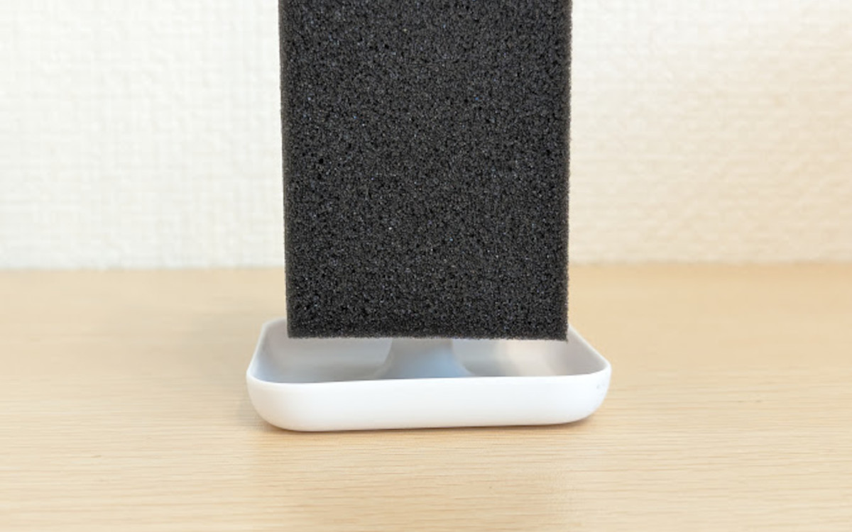 立てたスポンジの下をよく見ると、スタンドから離れて少し浮いた状態に。奥まで差し込んでも、スポンジの底はスタンドに触れない作りになっていました。隙間が空いていることで水切れもよく、スタンドに溜まった水は傾けて捨てればOKです。