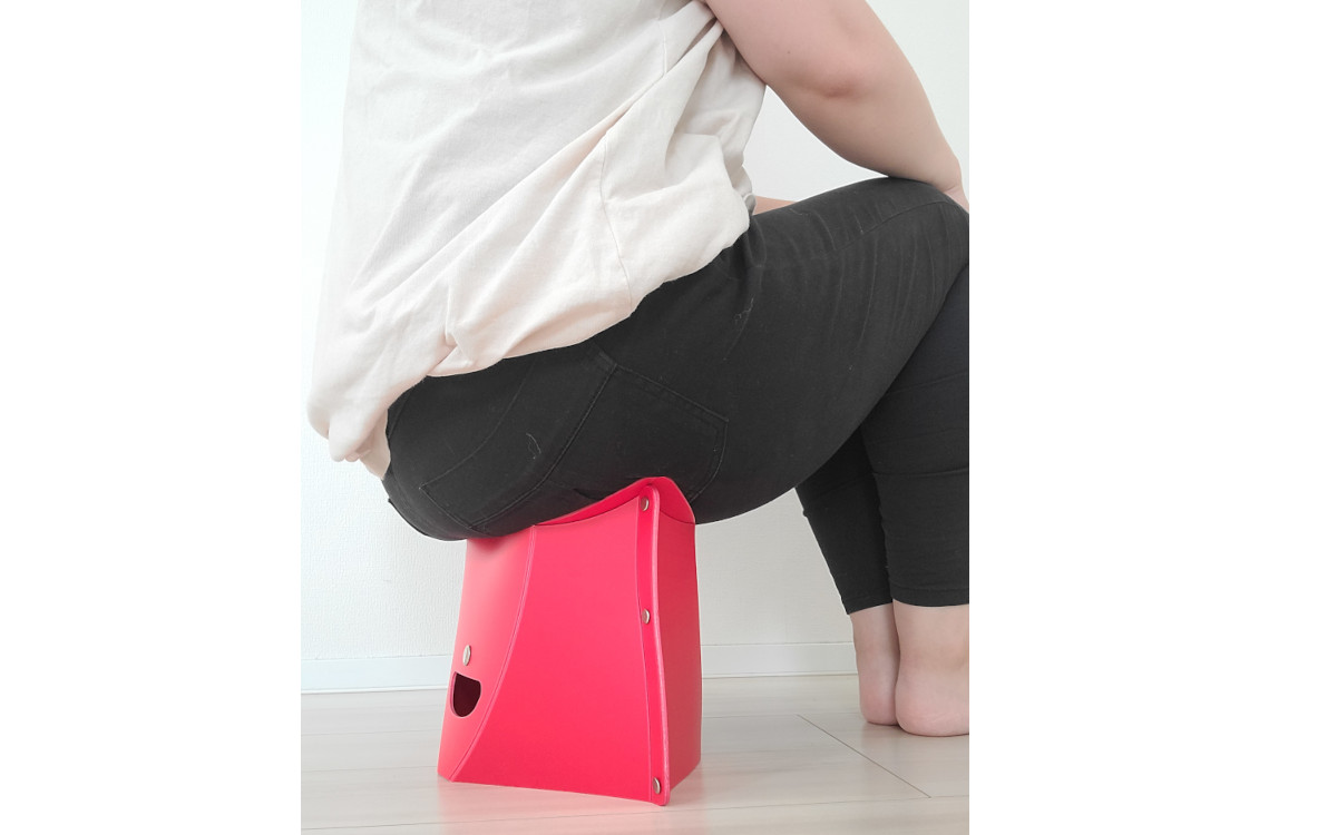組み立てたサイズは約31.5(幅)×19(奥行)×21cm(高さ)ほどで、耐荷重は100kgまでとかなり丈夫なつくり。ひっくり返した状態で座面を押すだけで組み立てることができ、もちろん使わないときはサッと折りたためます。材質は強度の高いポリプロピレンなので水にも強く、汚れたらすぐに洗えるのが嬉しいですね。