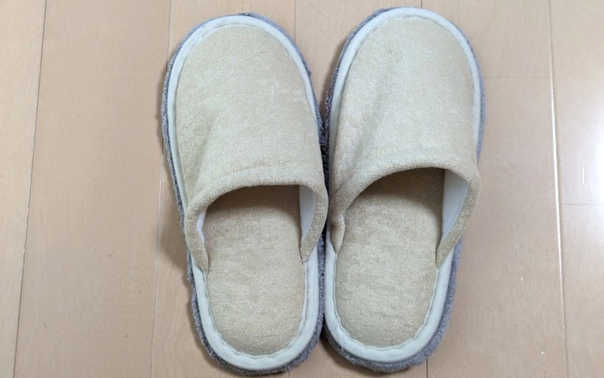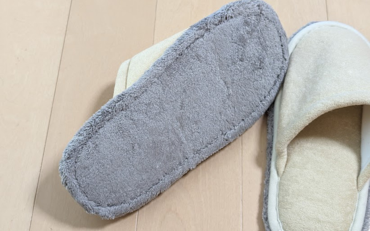 スリッパの大きさは、外寸の長さが約27.5cmで適応サイズは約22~25cm。一見普通のスリッパですが、裏側にモップのようなものが付いています。色はインテリアに馴染みやすいグレーとベージュがあり、どちらを選んでも裏側はグレー。今回はベージュを購入しました。