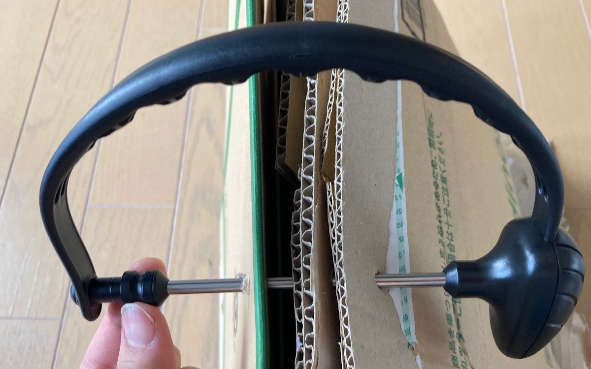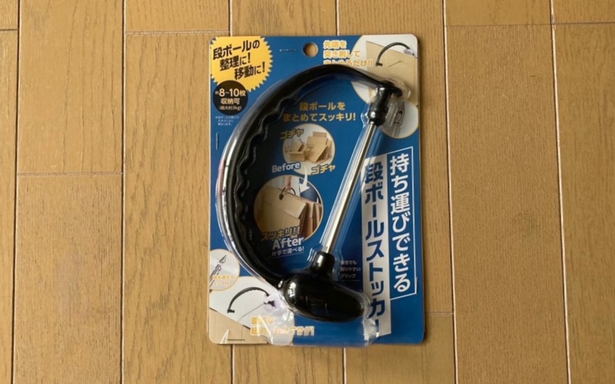 パッと見た感じはバックの取っ手部分だけを切り取ったようなこちらの商品。下部のシルバー部分が取り外しでき、段ボールをさしたまま保管することができます。段ボールの大きさが違ってもまとめられるのがうれしいですね。サイズは約17.5(幅)×12(高さ)×3cm(奥行)で、手すり幅は2cmくらいです。