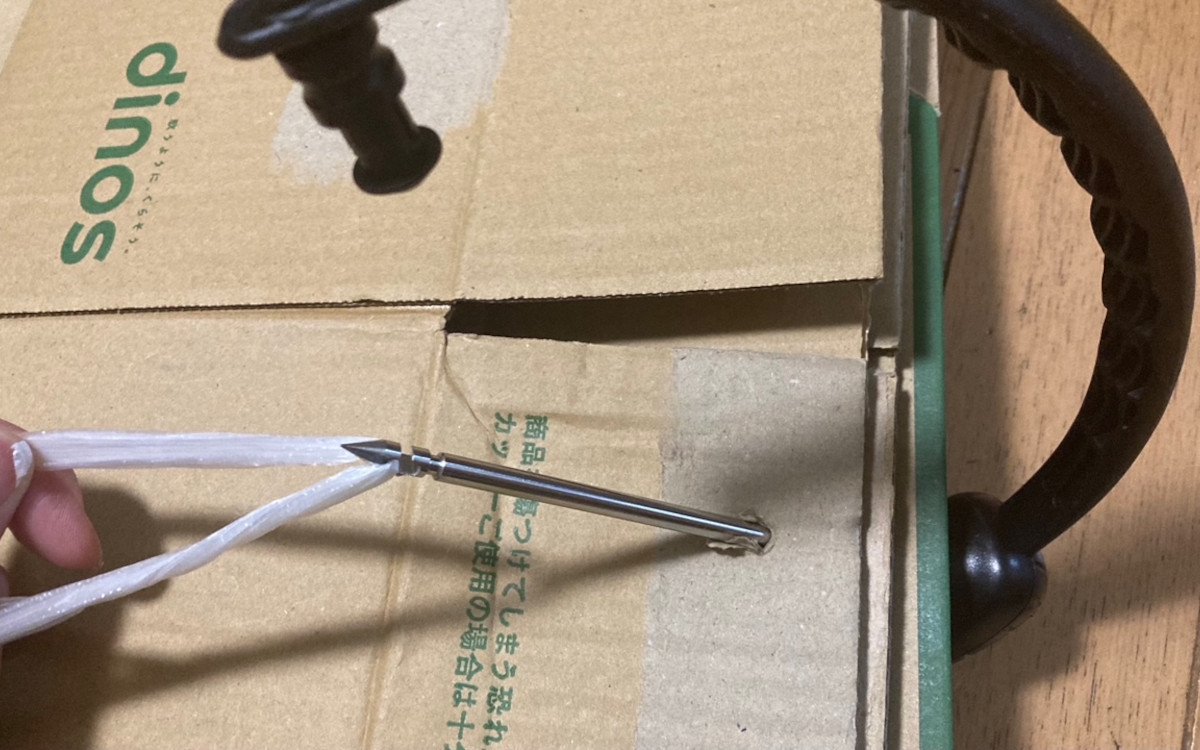 ドライバーのような先端部分を段ボールにさしこむときは、なるべく並行になるように気をつけましょう。貫通したら先端部分をロック付きの部品にはめこみ、カチッと音がするまでさしこみます。