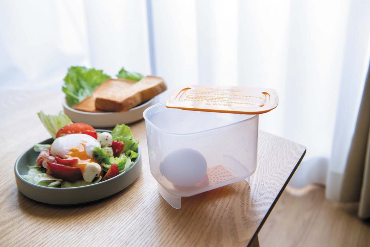 熱湯を注ぐだけで、温泉たまごを作れる容器。本品をシンクの中に置き、生卵2個と熱湯を入れ、底に空いた穴からお湯が流れ出るのを待つだけ。作り方が書かれたパッケージを紛失しても作れるよう、フタに作り方が刻まれている。
