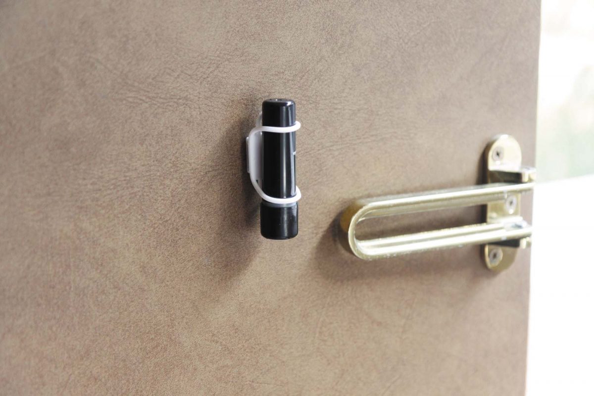 マグネットの付く玄関ドアなどに、はんこを貼り付けられるようにするホルダー。マグネット式のため、簡単に位置の調整や付け外しができる。シリコーン樹脂製のループが伸縮し、対象物をしっかりホールド。耐荷重は30gだ。