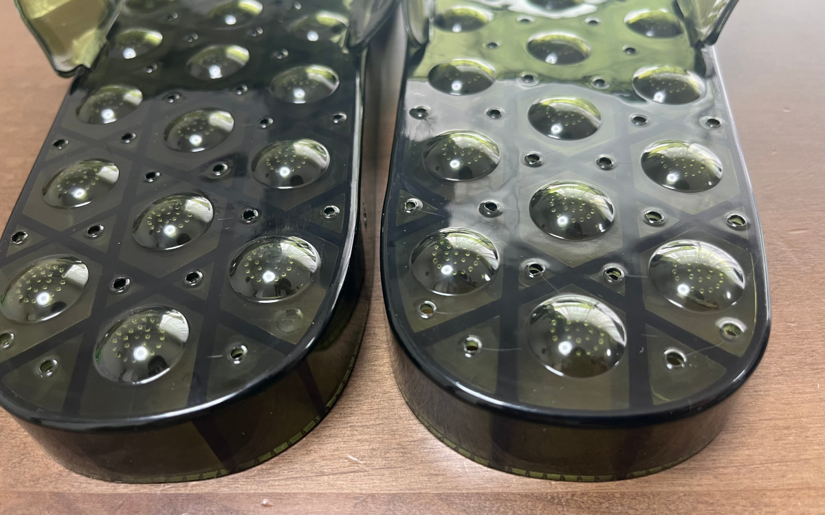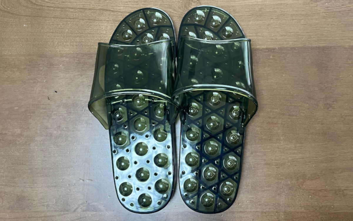 サンダルの表面は丸い凸凹構造で足の裏をほどよく刺激してくれます。凸凹は丸い形なので、長時間履きながら作業していても痛みはまったく感じませんでした。