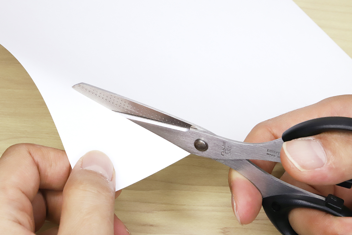 「二刀派ハサミ」は、開梱ツールとしてはもちろん、普段使い用のハサミとしての機能も充分なレベルにある。切れ味はかなりのもので、柔らかなフィルムからコピー用紙、硬いPPバンドまで、幅広く対応できる性能を持っているようだ。実際に切ってみた感覚としては、薄手のビニールやフィルムなどの柔らかいものをスパッと切る力はかなり強い。対して、ダンボールやPPバンドなどの硬めな素材だと少々力が必要かな、という印象だった。
