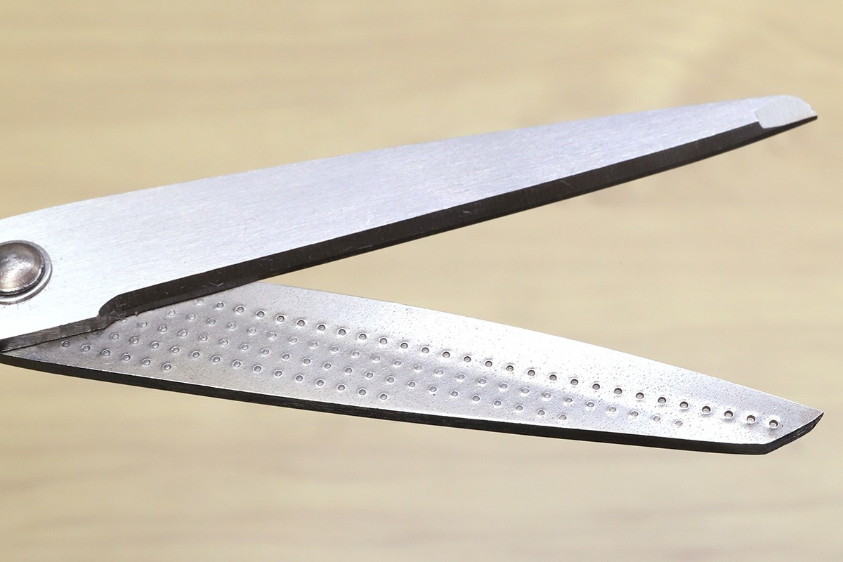 さらに刃の側面には、細かなリベット穴のような加工が一面にずらっと施されている。これはディンプル構造刃と呼ばれるもので、細かなくぼみによってテープなどの粘着材と接する面積を減らすことで、刃に粘着材が付着しづらくする工夫なのだ。フッ素コートほど強力な効果ではないが、長期間使い続けるうちに「ベタベタが溜まってジワジワ切れ味が落ちていくのを防ぐ」という効果は期待できそうだ。