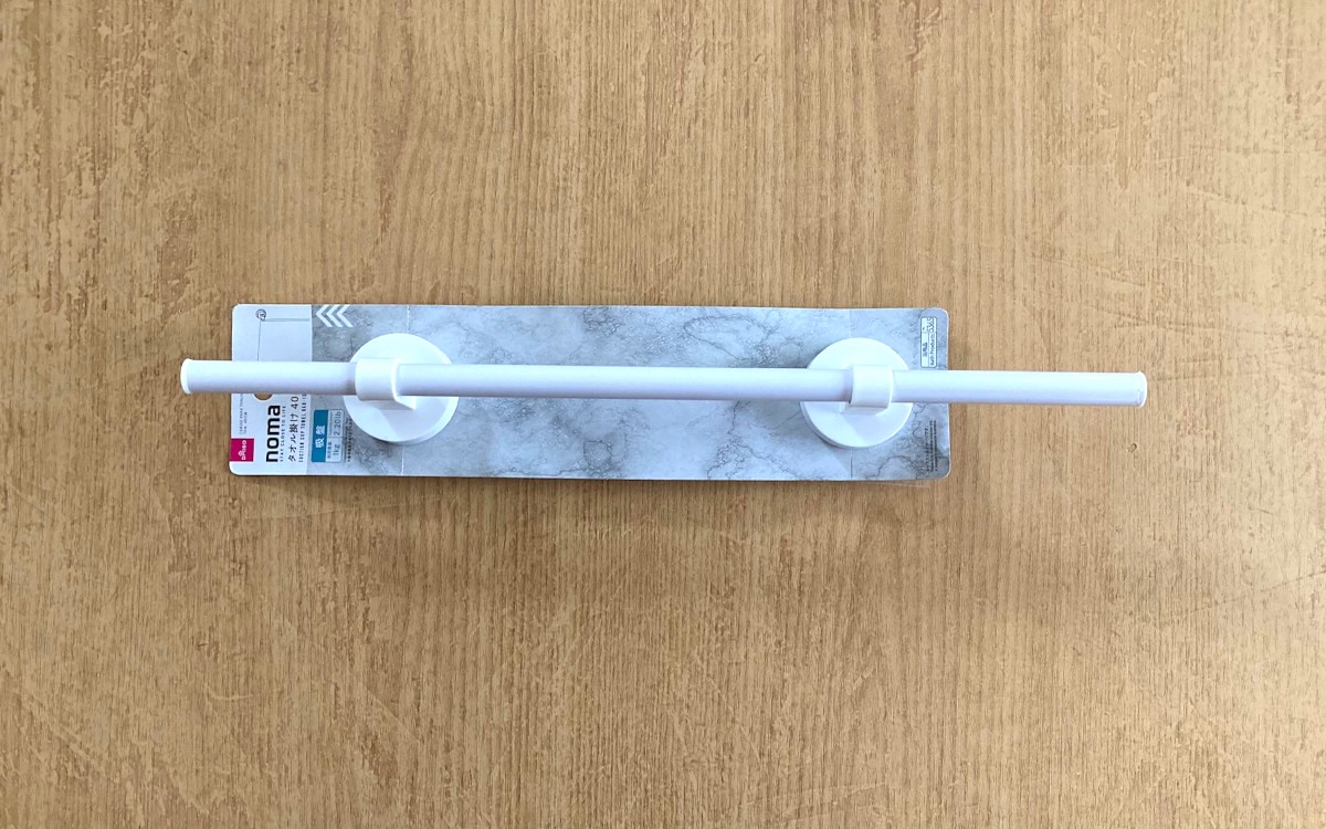ボディスポンジを掛ける場所が我が家のお風呂場になく、何かいいものはないかなといろいろと探していました。たまたまダイソーへ行ったときに見つけたのが、今回ご紹介する「タオル掛け(40cm、吸盤)」(110円/税込)です。お風呂の壁にも簡単にくっつけられそうなので試しに購入してみました。