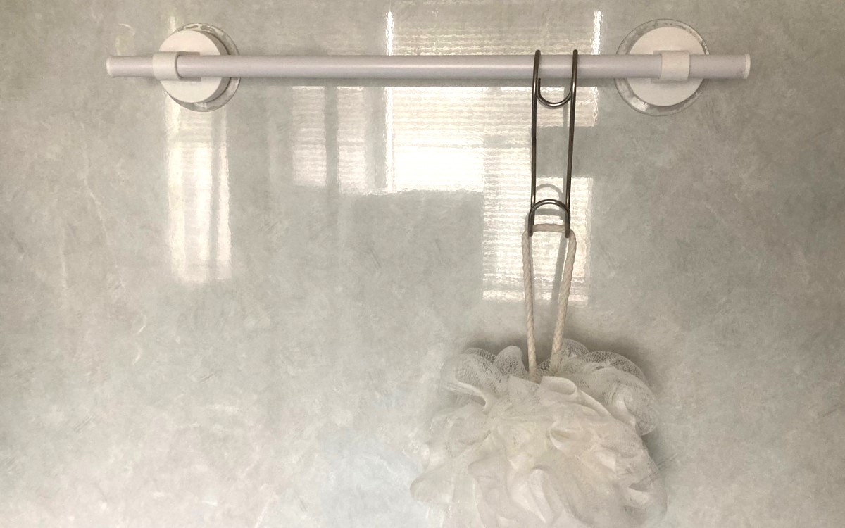 我が家のお風呂場の壁面にもバッチリくっついてくれました。指でバーの上から力を加えてみたのですが、かなりの弾力で跳ね返ってくる感じ。ボディスポンジももちろん問題なく掛けられました。使用済みのシャンプーやリンスのボトルを引っ掛けておけば底面にカビが生えなくていいかもしれません。