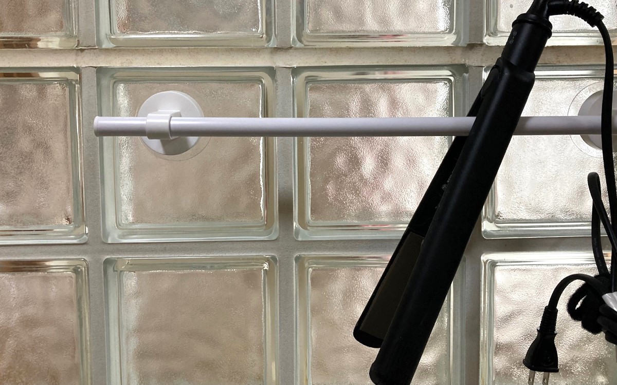 朝、家族が連続で使用するのですが、かなり熱を持つのですぐボックスにしまえなくて困っていたんですよね。洗面所にあるガラスブロックの部分にタオル掛けを設置してヘアアイロンをかけてみました。ヘアアイロンは開いたまま掛けられるので熱も早く逃がせそうです。
