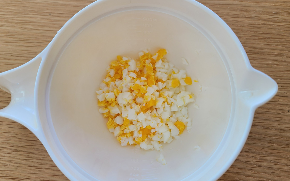 実際にたまごのみじん切りに挑戦してみましょう。ゆでたまごをストレーナーの上にのせたら、あとはスプーンで押すだけ。あっという間に綺麗なみじん切りが用意できました。食卓にたまごサラダの登場回数が増えそうです。