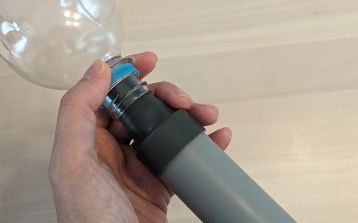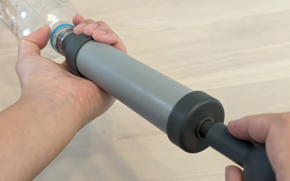 使い方は、本体の先の吸い込み口をペットボトルの飲み口にグッと挿入。差し込んだ部分は片手で固定しておきます。