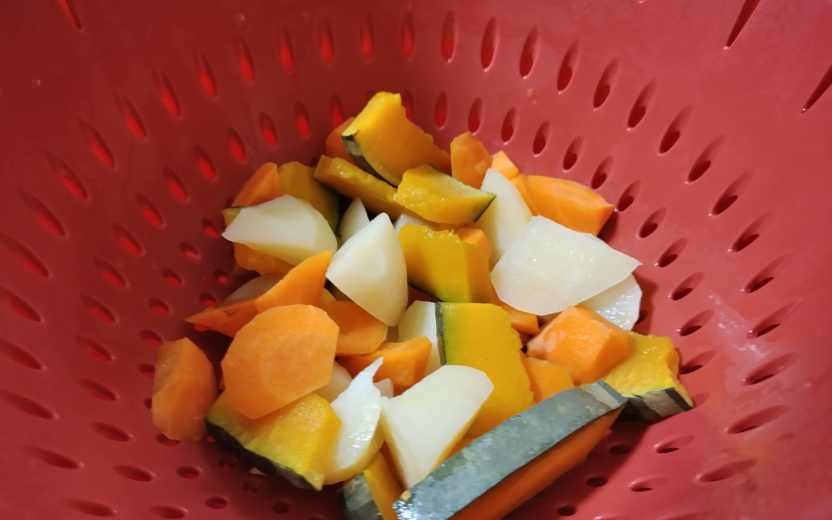 同商品の魅力の一つが電子レンジでの加熱が可能なこと。根菜類をさっと洗って水を切ったら蓋をして、そのまま電子レンジへ。余分な水分はボウルに落ちることで食材がベチャっとならず、ホクホクの温野菜ができあがりました。またラップを使わないので、開けるときに熱を感じにくくやけどをする心配がないのもGOOD。