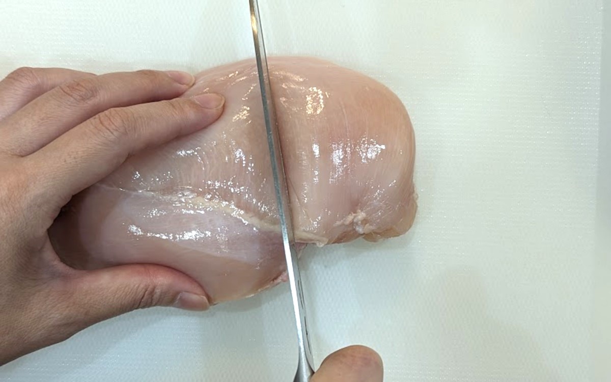 まな板の上にまな板シートを敷いて、実際に鶏肉を切ってみることに。力を加えて肉を切ったので、まな板シートが切れていないか心配でしたが全く切れていませんでした。凸凹な面のおかげで食材が滑りにくく、調理もしやすかったです。