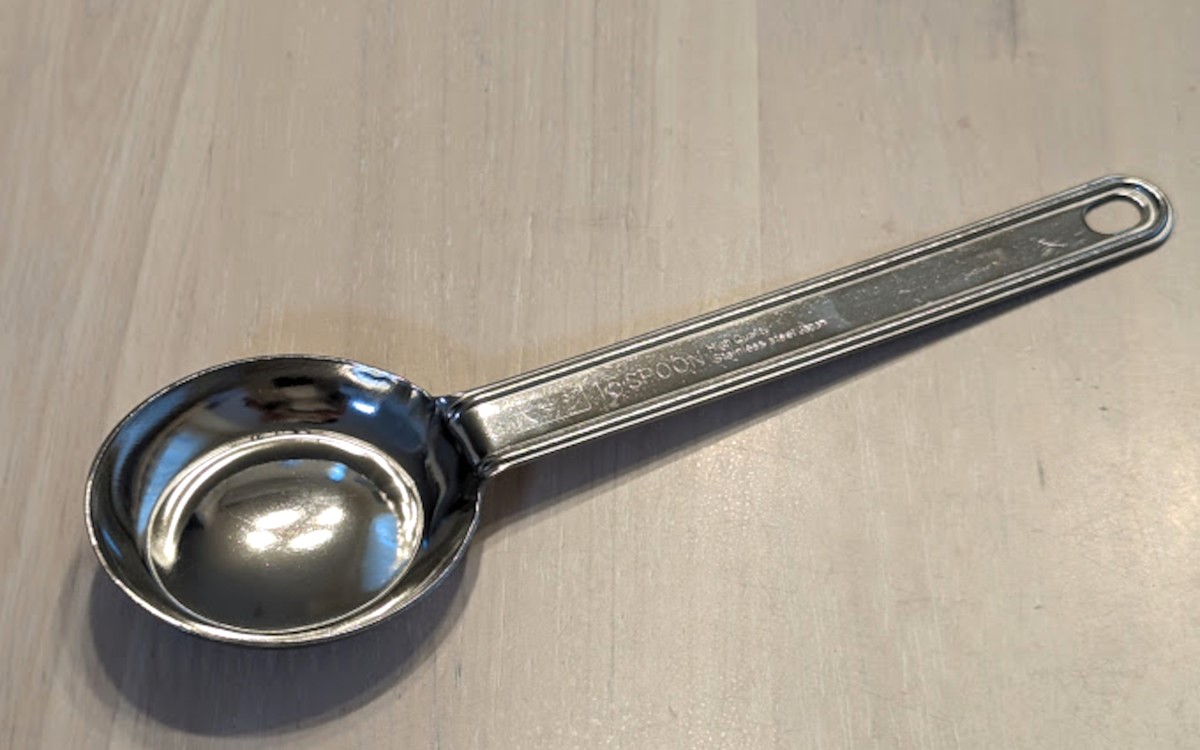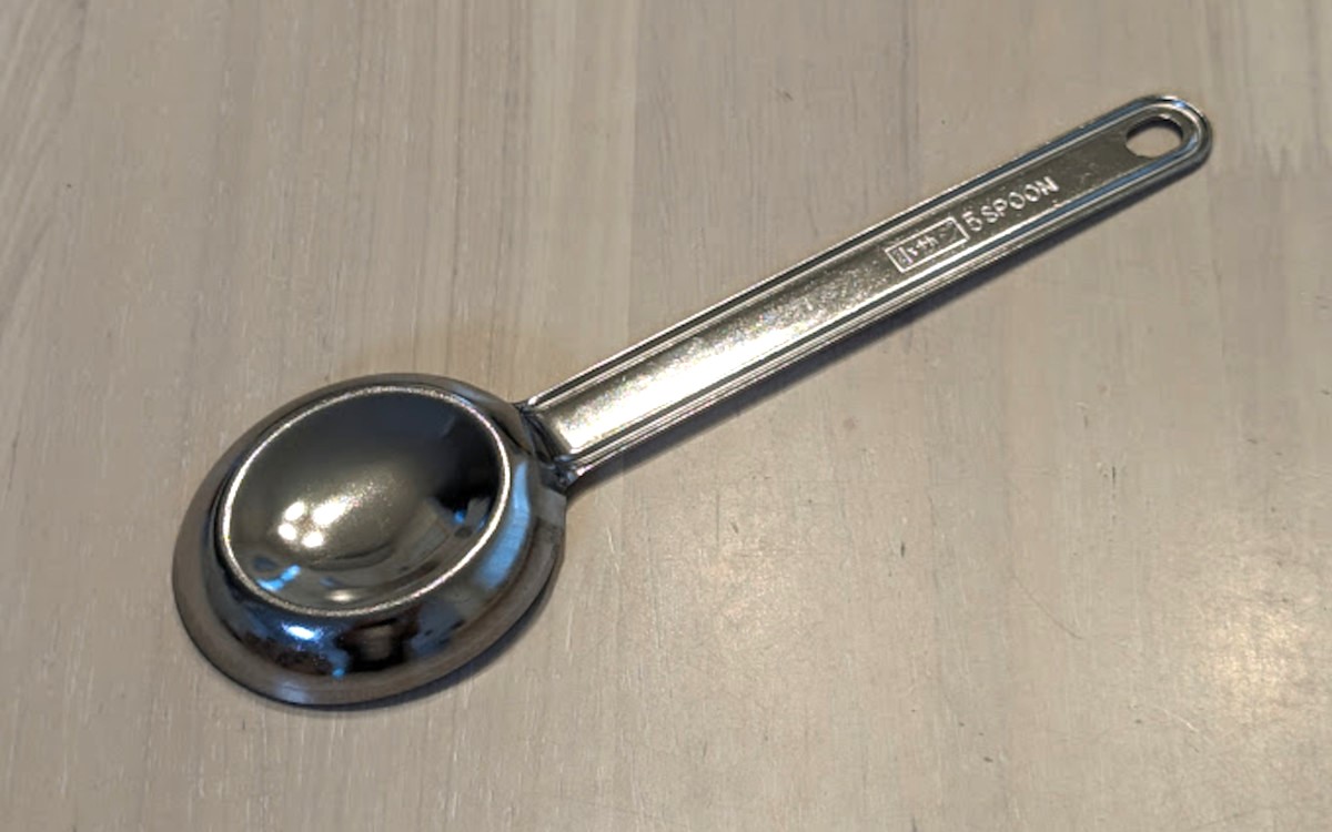 大きさは横幅およそ5.5×高さ1.2cmで、全体の長さがおよそ19.2cm。持ち手の端には引っかけられるよう穴が開いていました。一見ふつうの計量スプーンに見えますが、大さじ側を上にしてみるとスプーンの中央部分が少し盛り上がっています。