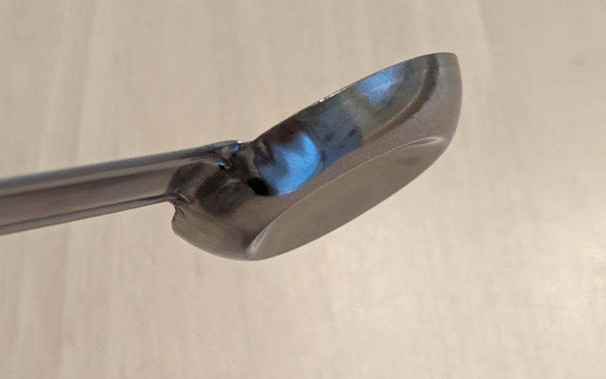 スプーンを裏返すと持ち手に“小サジ”と書かれていて、大さじ側とは逆にスプーンの中央部分だけ凹んだ状態になっていました。横から見ても明らかに底が凹んでいるのがわかります。