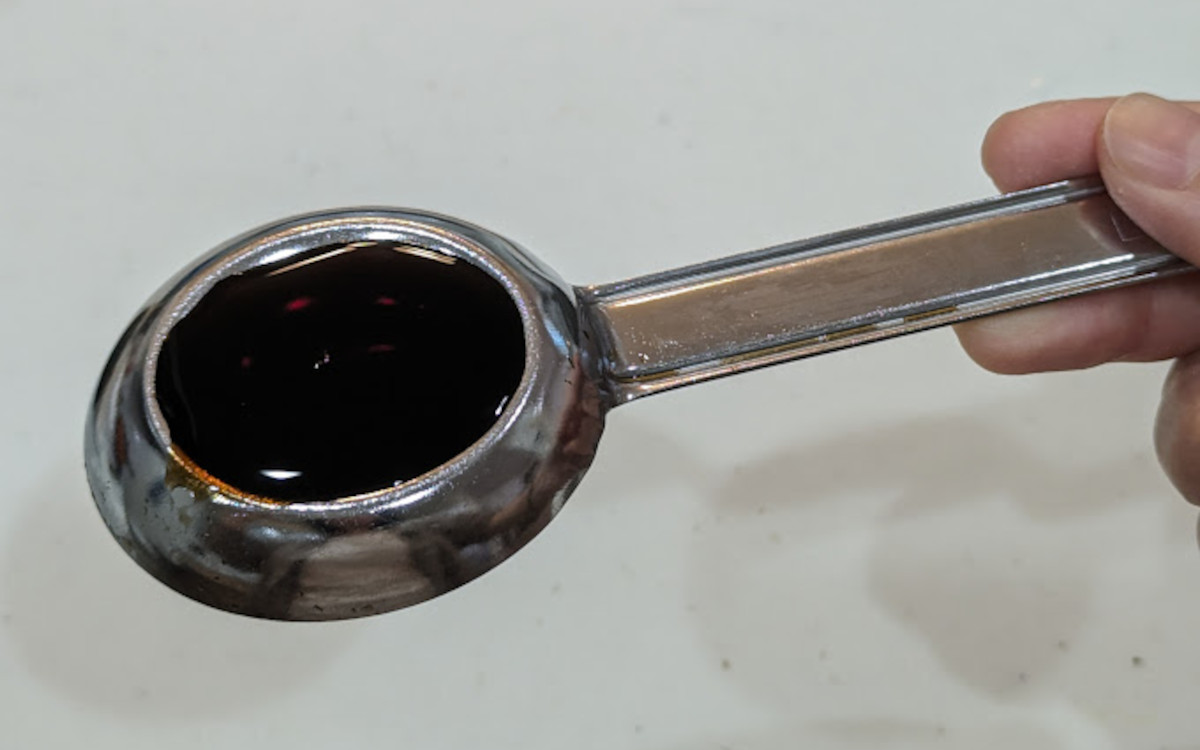 実際に醤油を量ってみました。大さじ側は中央が盛り上がっていますが、醤油を入れてみたらよくある計量スプーンと見た目は変わりません。