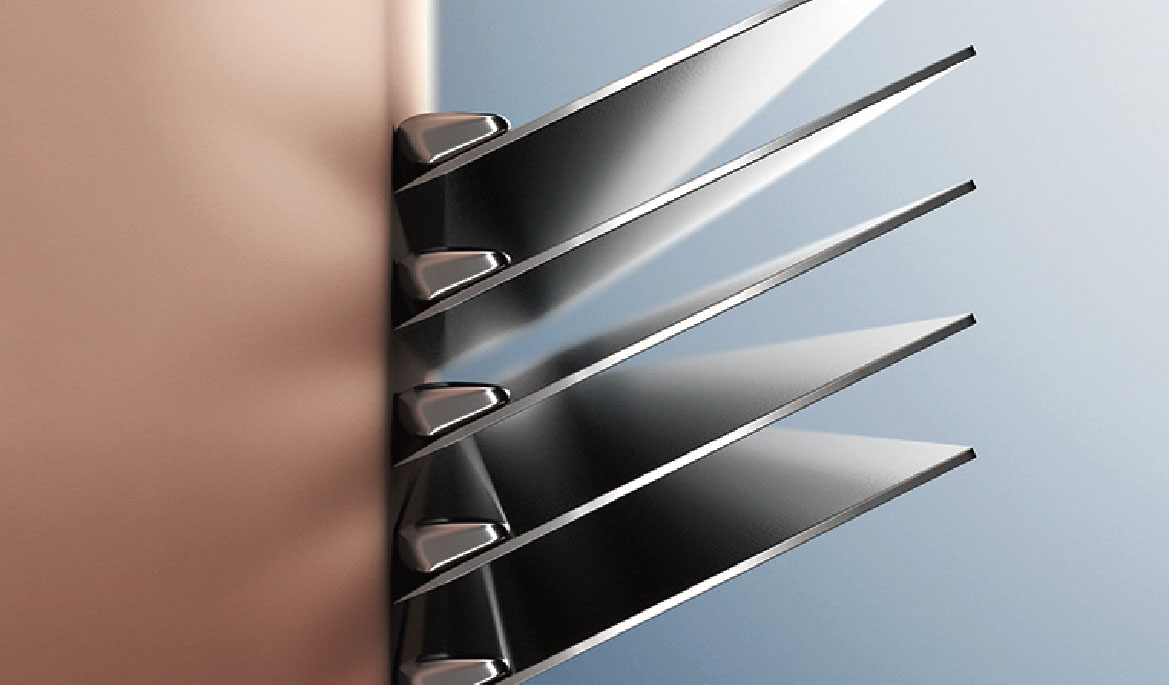 多層ナノコーティングが施された「5枚刃」も特徴。1枚、2枚よりも、刃の面積が増えるので肌負担が軽減されます。そしてすごく細かいですが、よく見ると刃だけではありません。1枚1枚の刃に付いている「スキンガード」があることによって、刃と刃の間に肌の食い込みを防ぐので、ヒリヒリから肌を守ります。