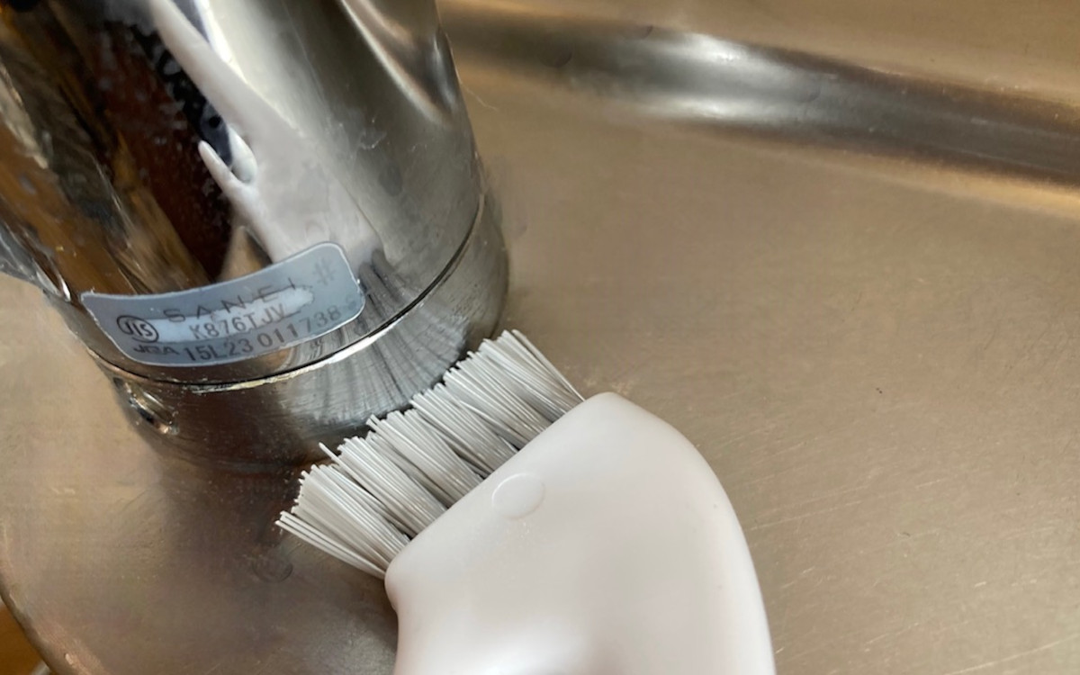 キッチンの水道の蛇口周りは水垢が溜まりやすいですが、ハケタイプのブラシを使えば汚れをキレイにかきだしてくれますよ。調理中、野菜くずが飛び散ったときもホウキのように掃いて流しに落とすことができます。