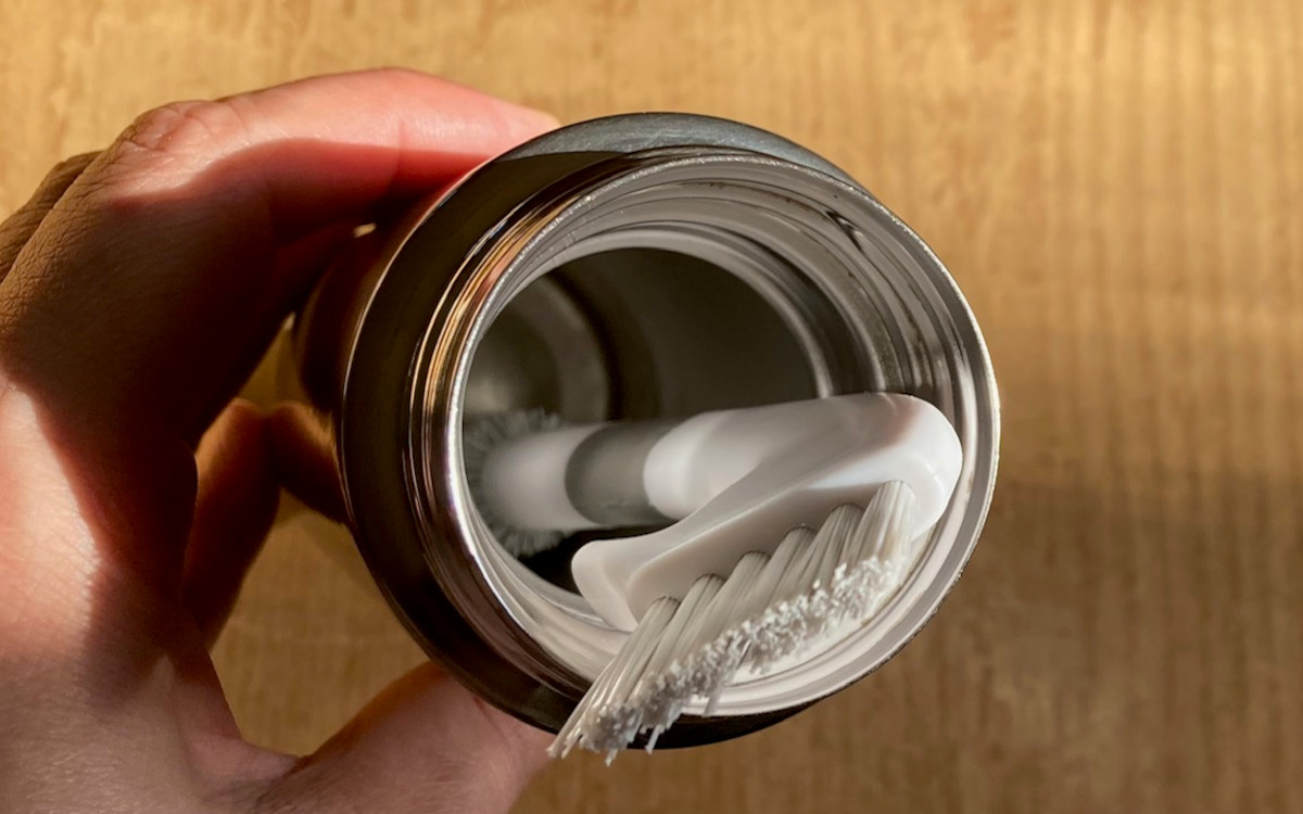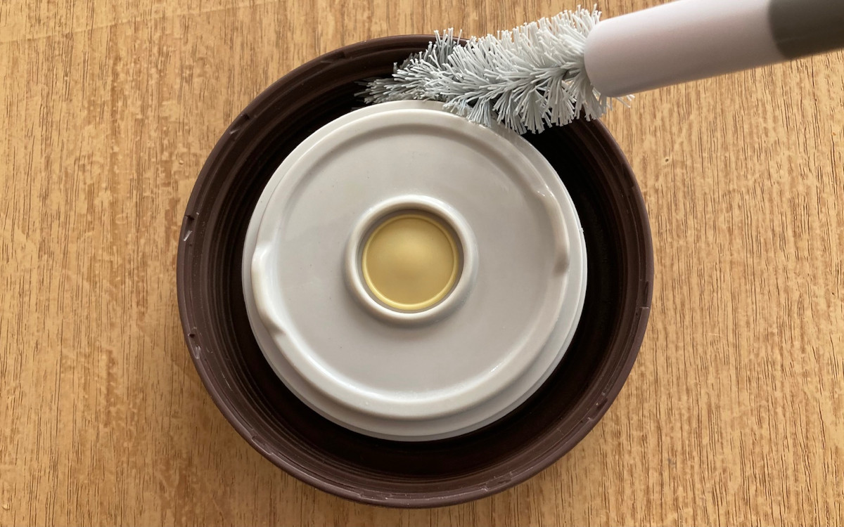 下部の巻きブラシは水筒やスープジャーのミゾ部分にフィット。「汚れが落ちている」という手応えが感じられます。300mlくらいの水筒なら本体奥までギリギリ届くので、ブラシ1本ですべてのパーツが洗浄できました。
