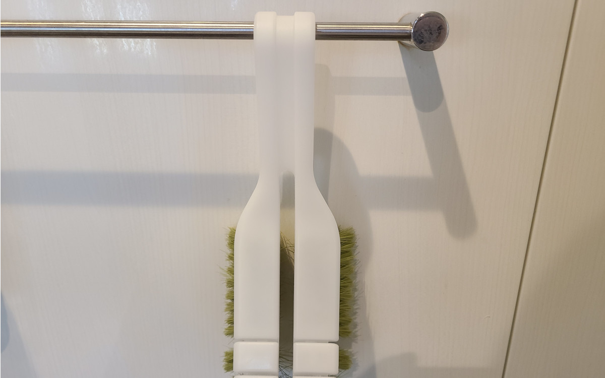 実際にお風呂用の中性洗剤をつけて泡立ててみると、こんなに泡立ちました。これだと浴槽を傷つけずに洗うことができそうですね。大きさは約11(幅)×27(長さ)×10cm(高さ)のコンパクトサイズ。柄の下がカーブしているので、フックのようにして吊り下げて収納することができます。
