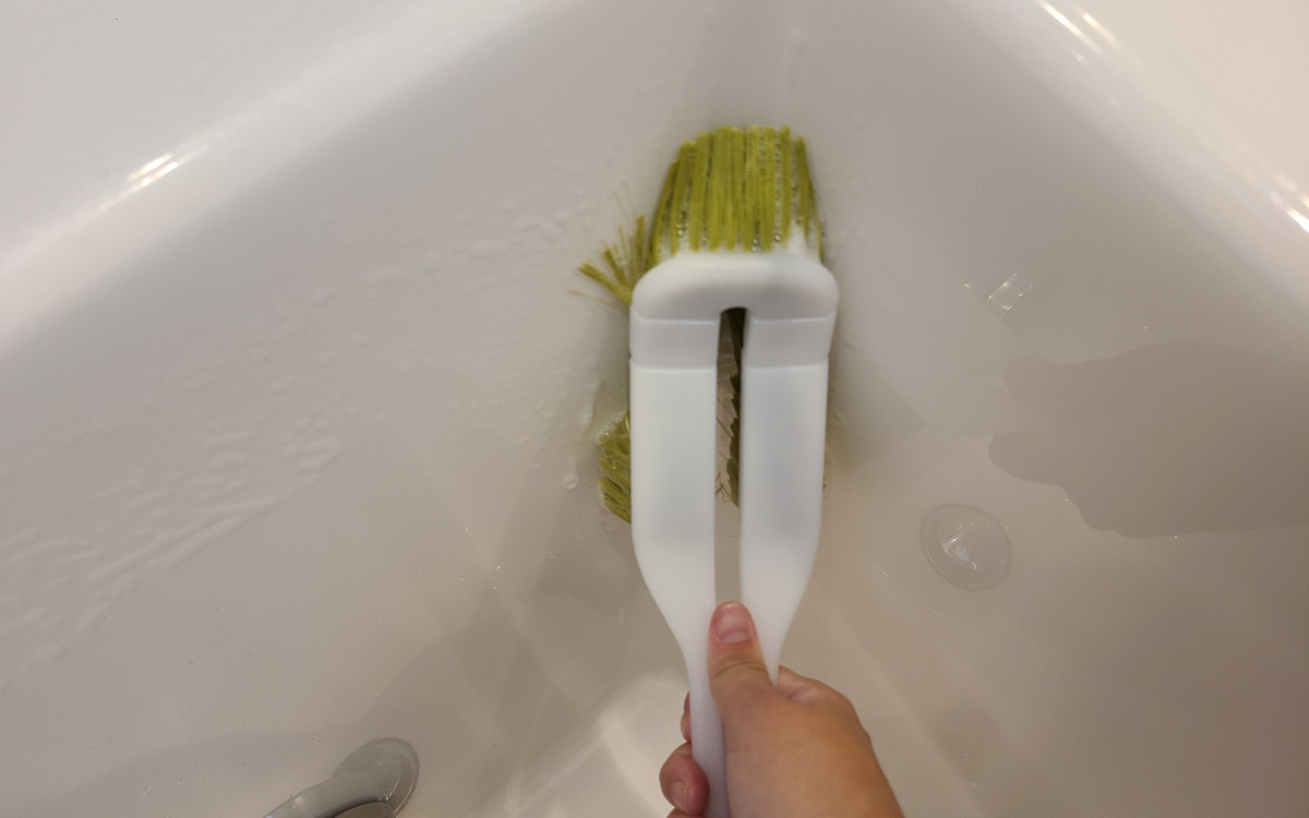 汚れの落ち具合も見てみます。浴槽のフチについてしまった汚れを擦ってみました。力を入れずに擦っただけですが、スポンジでは届かなった細かな溝にブラシがしっかりと届いて、あっという間に汚れが落ちました!