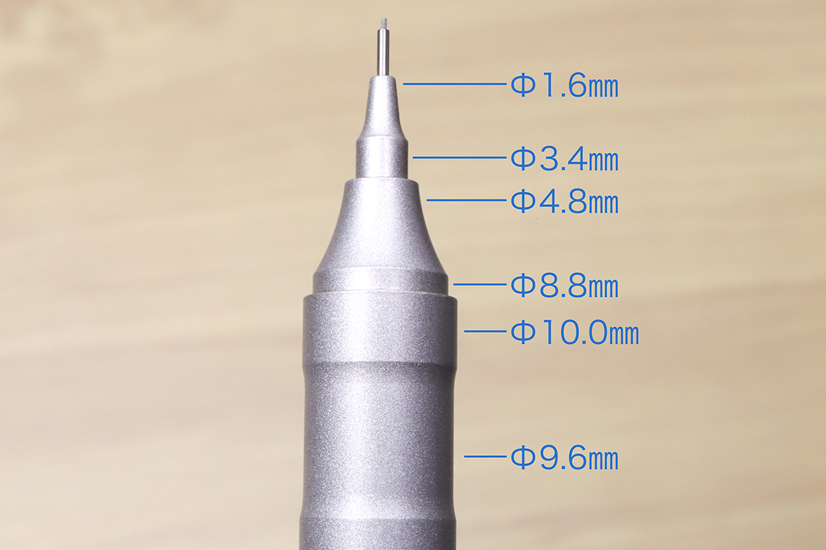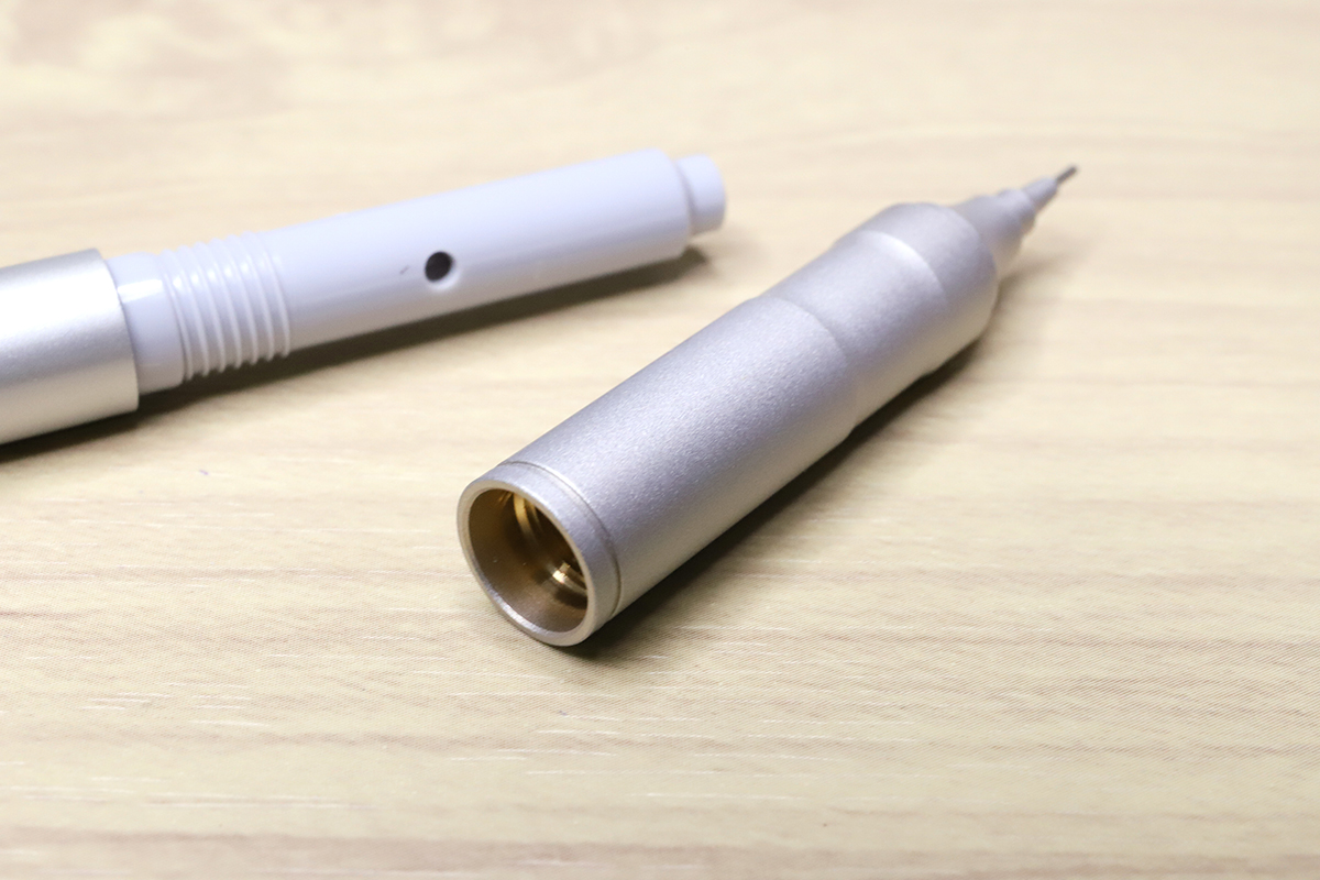 軸全体の雰囲気がシンプルなだけに、まず目を引くのが先端コーン周りの緻密な形状だろう。こちらはまずΦ10mmのボディをΦ8.8mmに削っている。これを逆アール加工でΦ4.8mmに削り、さらにΦ3.4mmに削り段差をつけてから、再び逆アール加工でΦ1.6mmまで削って先端パイプにつなげる、という4段のテーパー加工になっている。この加工によってシルエットをスリムにし、ペン先周りの見通しを良くしよう、という狙いのようだ。