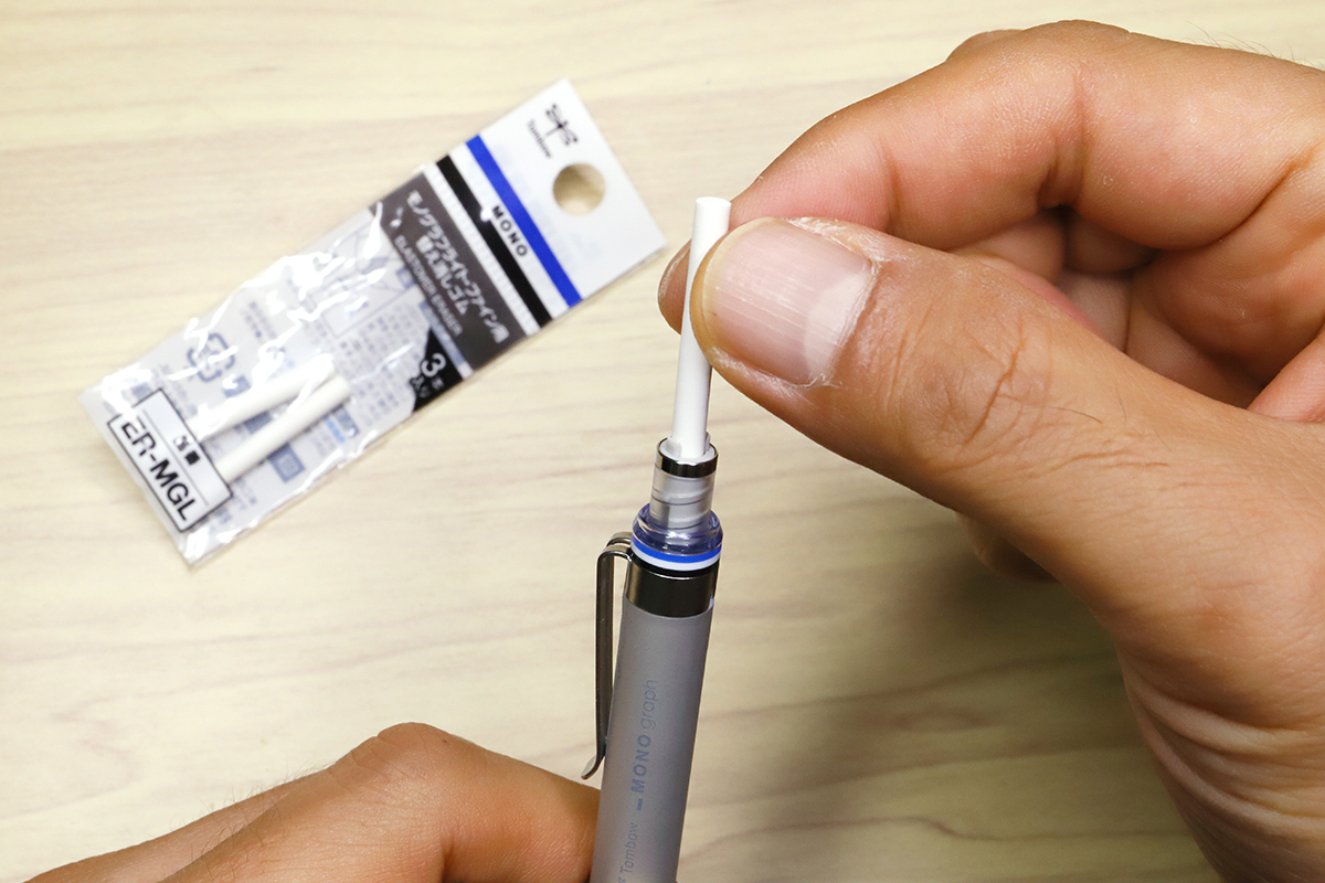 消しゴムはやや硬めながら、さすがMONOブランドだけあって、消字力は間違いない。スリムさを活かして細かな部分修正も簡単にこなせる。ちなみに、消しゴム自体は消耗部品として別売り(モノグラフライト/ファイン用)されているので、気兼ねなくガンガン使えるのも嬉しい。