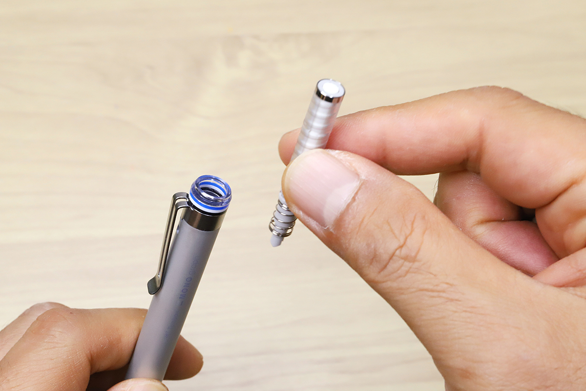 消しゴムの交換は、ノブを回して消しゴムをいっぱいまで出し切ったら指でつまんで取り出し、新しい消しゴムを装着するだけ。芯の入れ替えをする場合には、消しゴム内蔵のノックノブをそのまま引き抜くと、芯タンクへの穴がオープンになる。最初は少し迷うかもしれないが、一度やれば簡単に分かるはずだ。