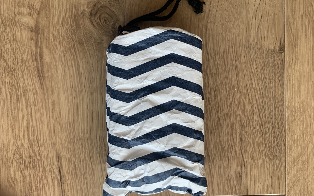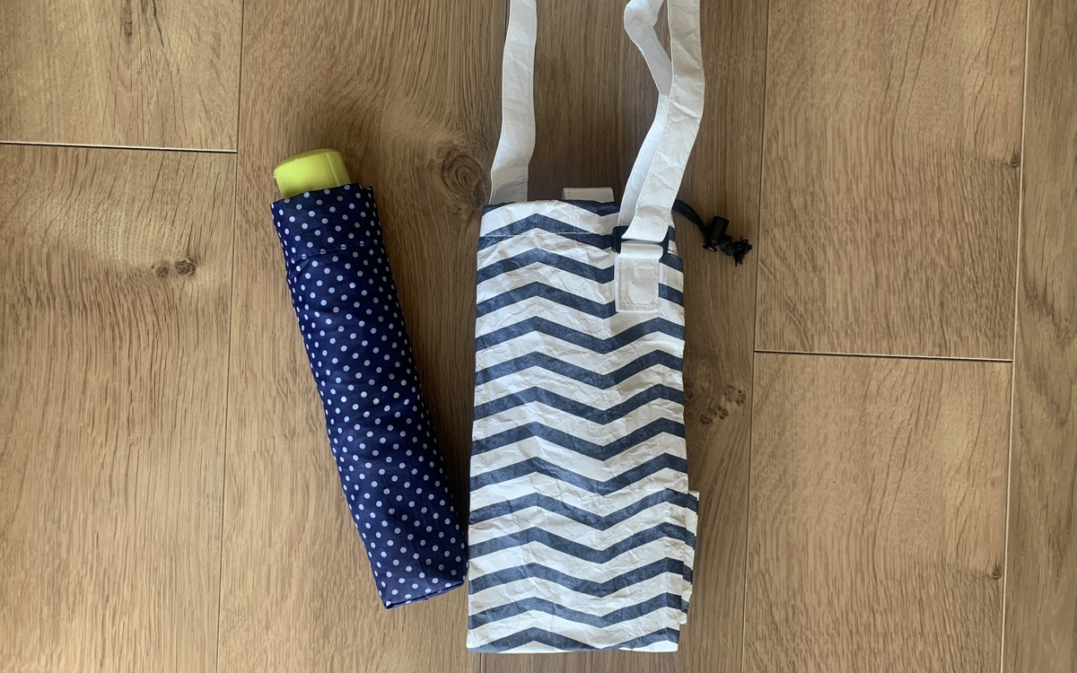 さっそく開封すると、手のひらサイズの収納袋に収まったアンブレラバッグが登場。これだけ小さいと使わない時にカバンに忍ばせておいてもかさばりませんね。