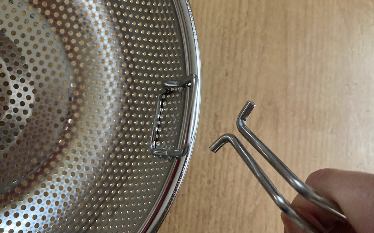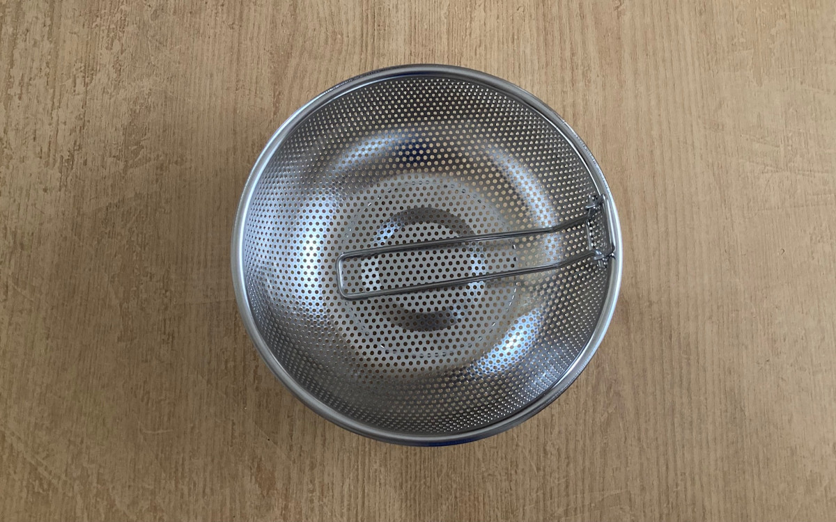 パスタやブロッコリーなどを茹でてザルにあげるとき、取っ手がついていると便利ですよね。我が家はプラスチック製の取っ手付きザルがあるのですが、やはり見た目が安っぽい…。たまたまダイソーで買い物をしていたときに見つけたのが、「折りたためるステンレスパンチングザル(22cm)」(330円/税込)でした。