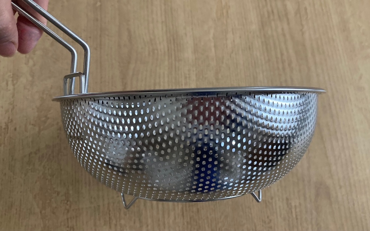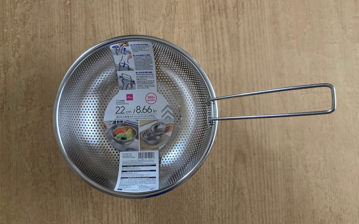 ●取っ手の取り外しも可能な「折りたためるステンレスパンチングザル(22cm)」(ダイソー)