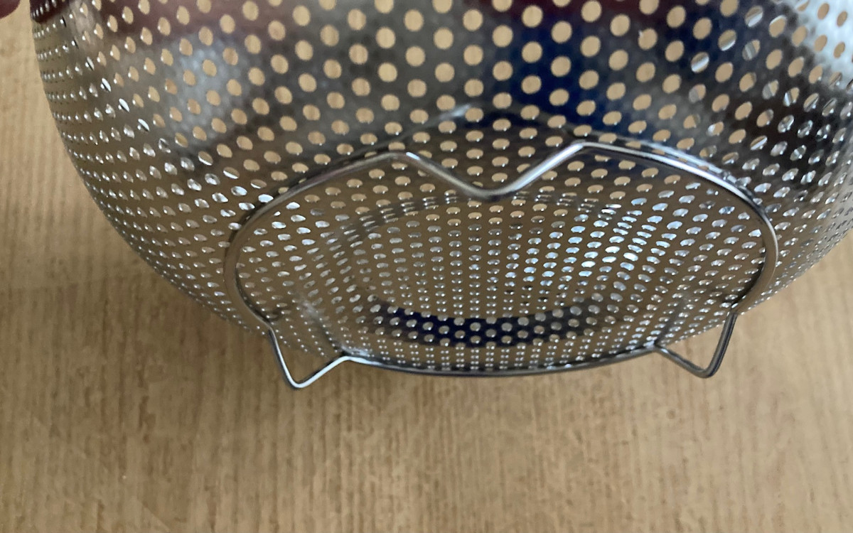 パンチングザルの直径は約22cmで、高さはおよそ8cm(脚含む)。底面には脚が3本ついているのでシンク内に置いたままお湯を切ることができます。ザルと同じ素材で作られた脚は本体と一体感があってオシャレ。キッチンに置きっぱなしでも生活感を感じさせません。