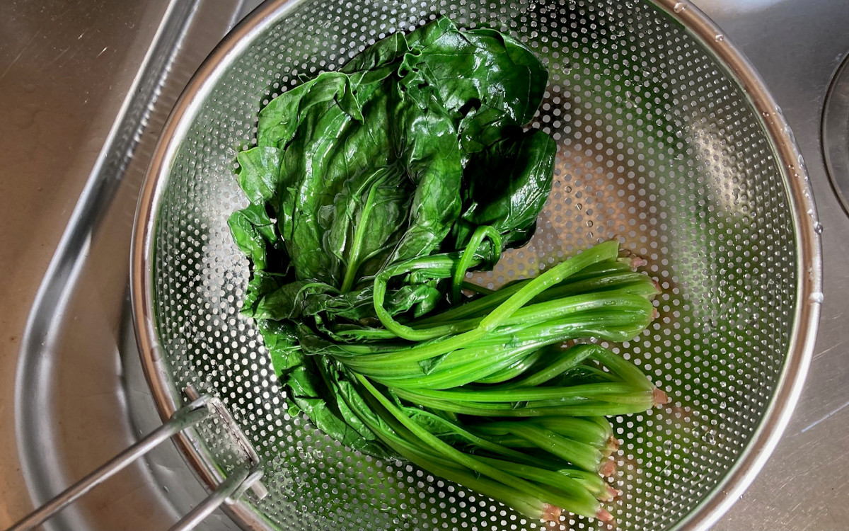 試しにほうれん草を1把茹でてザルにとってみました。直径が22cmくらいあるので丸ごとラクラク入ります。ちなみに茹で時間4分の細目のパスタを作るときも使用してみたのですが、茹で上がりのパスタがザルから数本はみ出てしまいました。ザル穴の直径が約2~3mmなので、もう少し太めのパスタだったらはみ出ないかなと思います。
