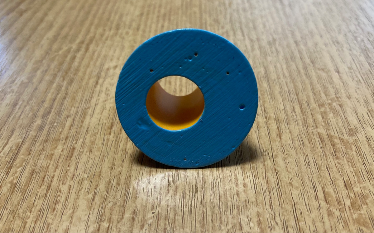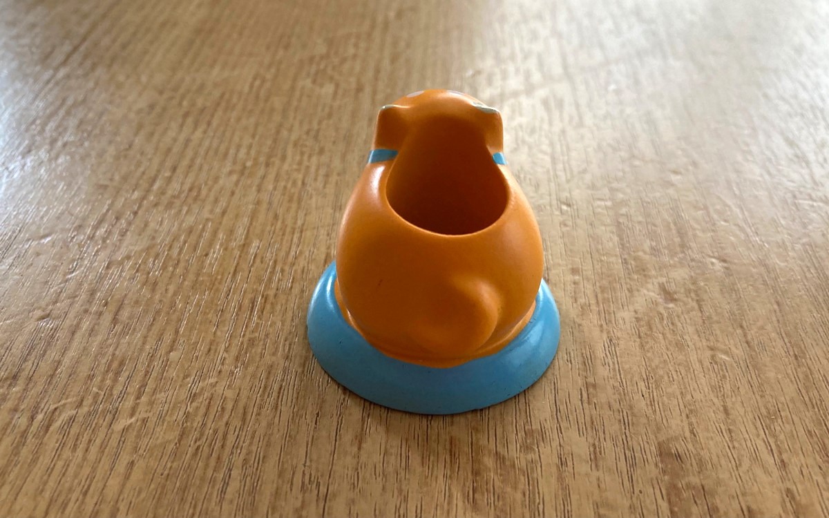 台座の下には商品説明のラベルが貼り付けてありますが、取り除くとぽっかり穴が開いていて歯ブラシの水切りもバッチリ。柴犬の首輪と台座は爽やかな水色のカラーリングで、毛色全体の明るめの茶色とマッチしています。