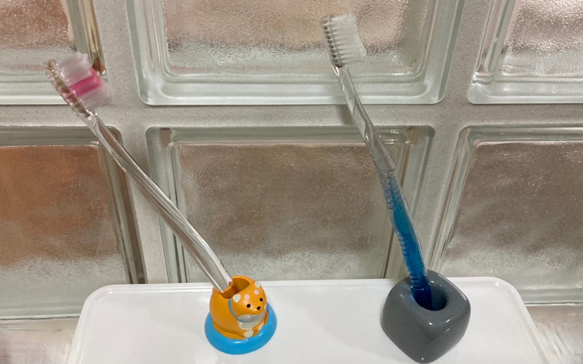 実際に洗面所で歯ブラシを入れてみました。白がベースの洗面所なので台座の明るい水色が思いのほか清潔感を感じさせてくれます。我が家の歯ブラシは家族それぞれカラーは異なるものの、ほぼ同じデザイン。並べていると間違えてしまいそうになるときもありますが、スタンドが違うだけでかなりわかりやすい! 歯ブラシの取り間違い防止にも最適なグッズではないでしょうか?