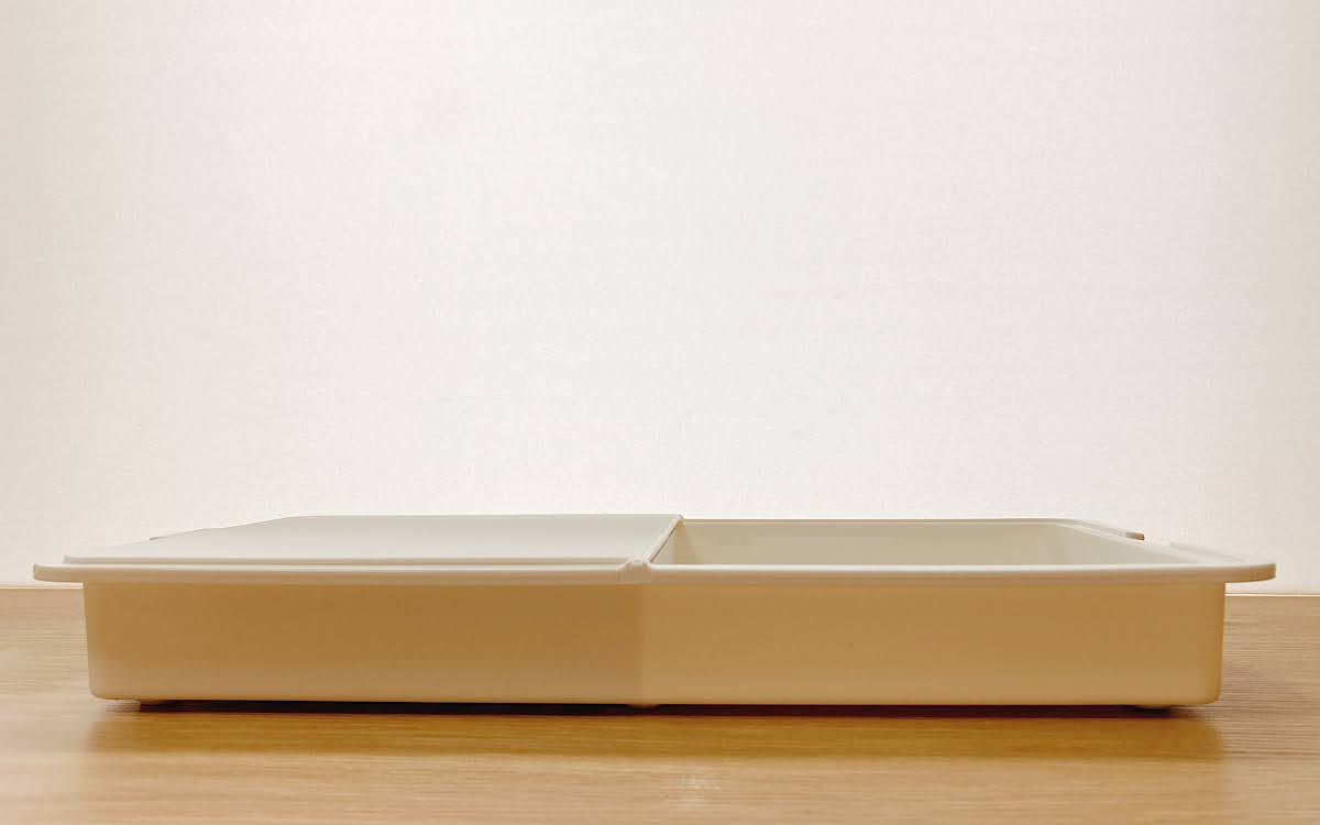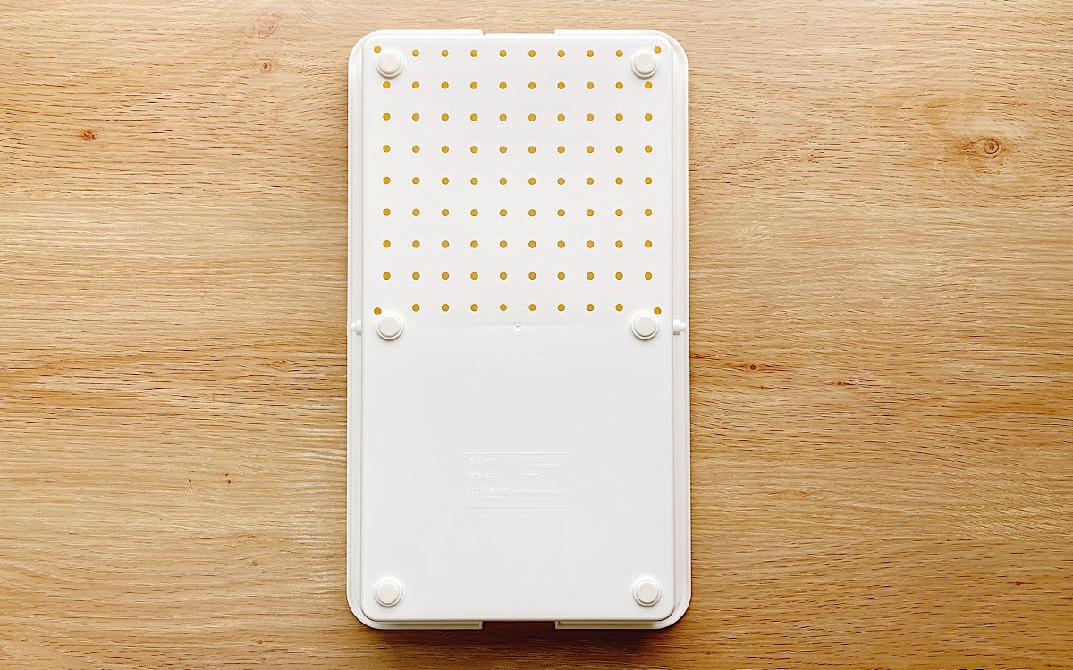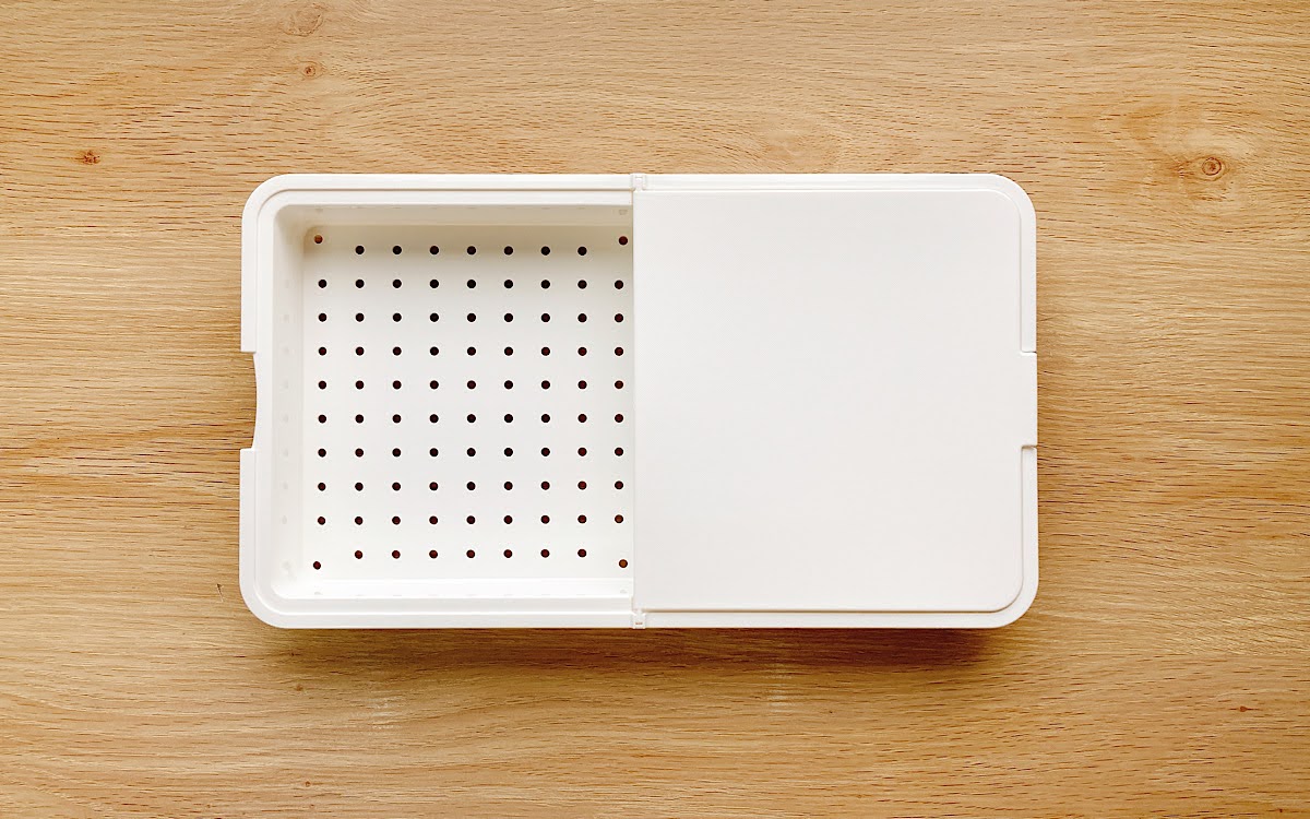 トレーと水切りザルは、まな板をパタンと左右に動かすことで使い分けできるようになっていました。まな板は両面使用できるため、肉や魚、野菜など食材に応じて使い分けできます。