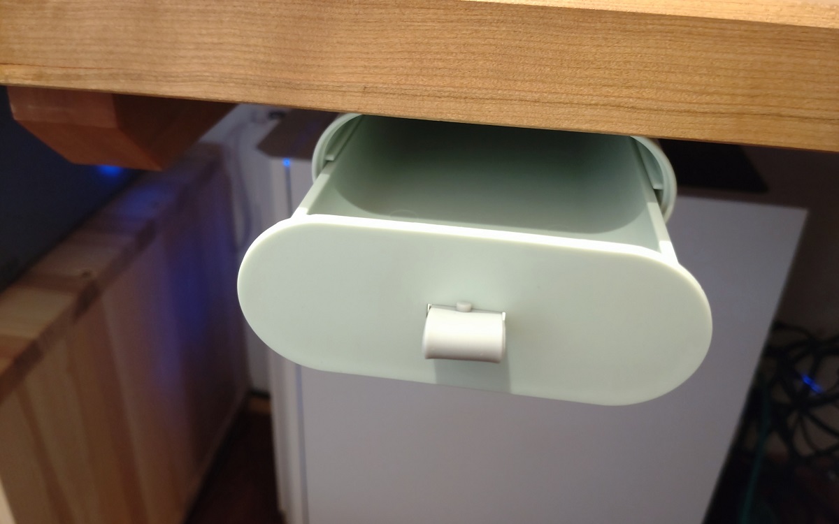 「卓上」と名前にありますが、机の上で使うだけじゃないのが当商品のすごいところ。付属の粘着シートを貼れば、デスク下にも設置できます。粘着シートは厚みのある強粘着タイプで、使っているうちに落ちてしまう心配は無し。ただし念のため、接着後12時間以上経ってから物を入れましょう。