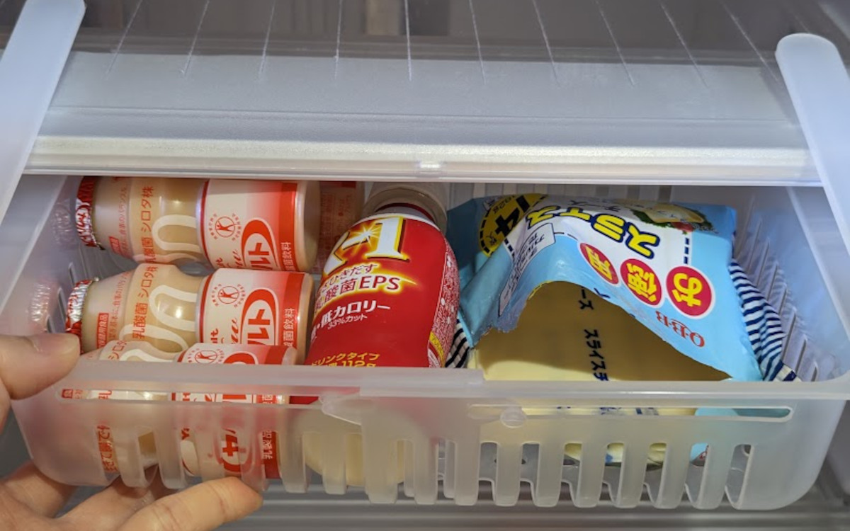 わが家ではチーズやヤクルトを入れてみました。一番大きく広げて使うと、ヤクルトだけで10本くらい入る大きさです。冷蔵庫内で散らかりやすい小さめの調味料やタレの小袋を保管するのもオススメ。